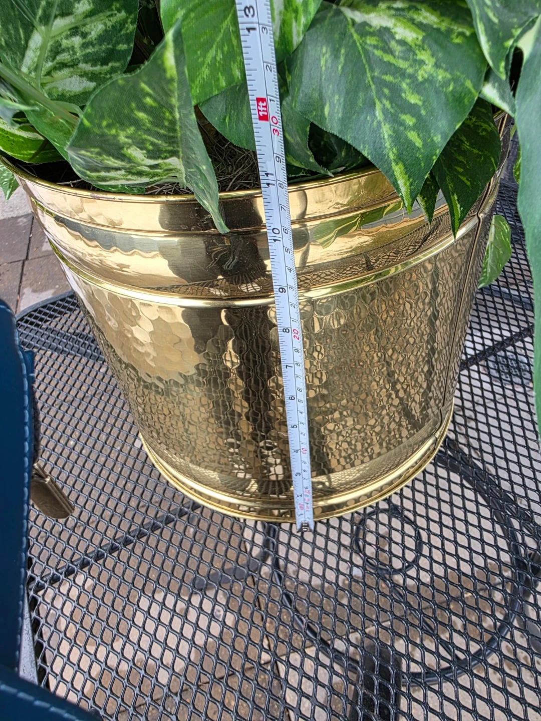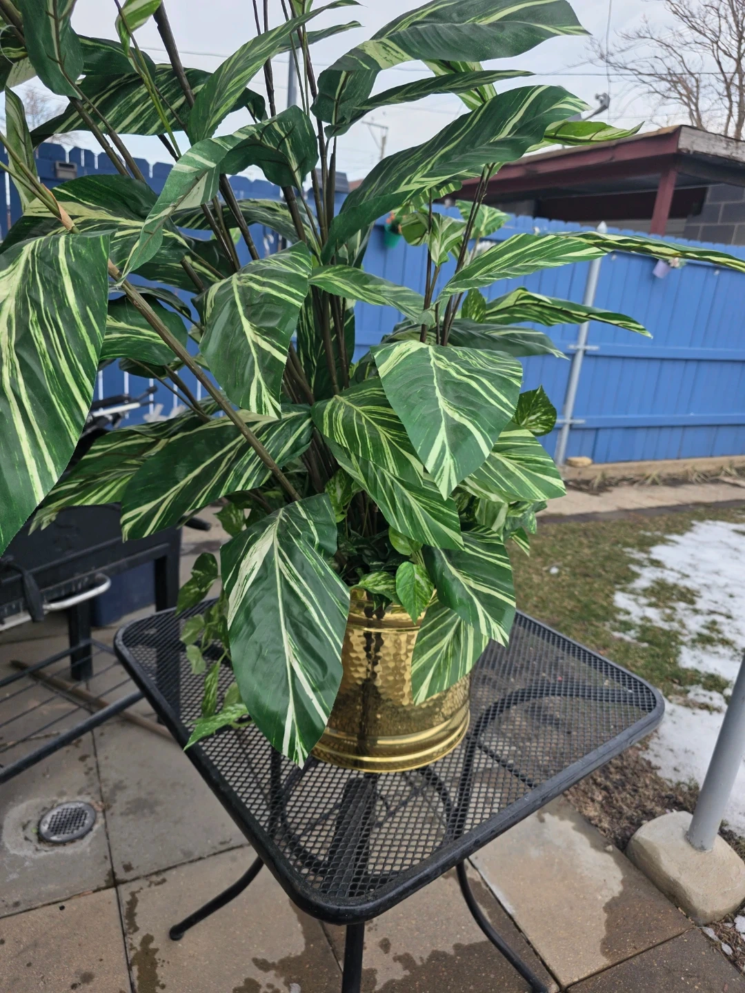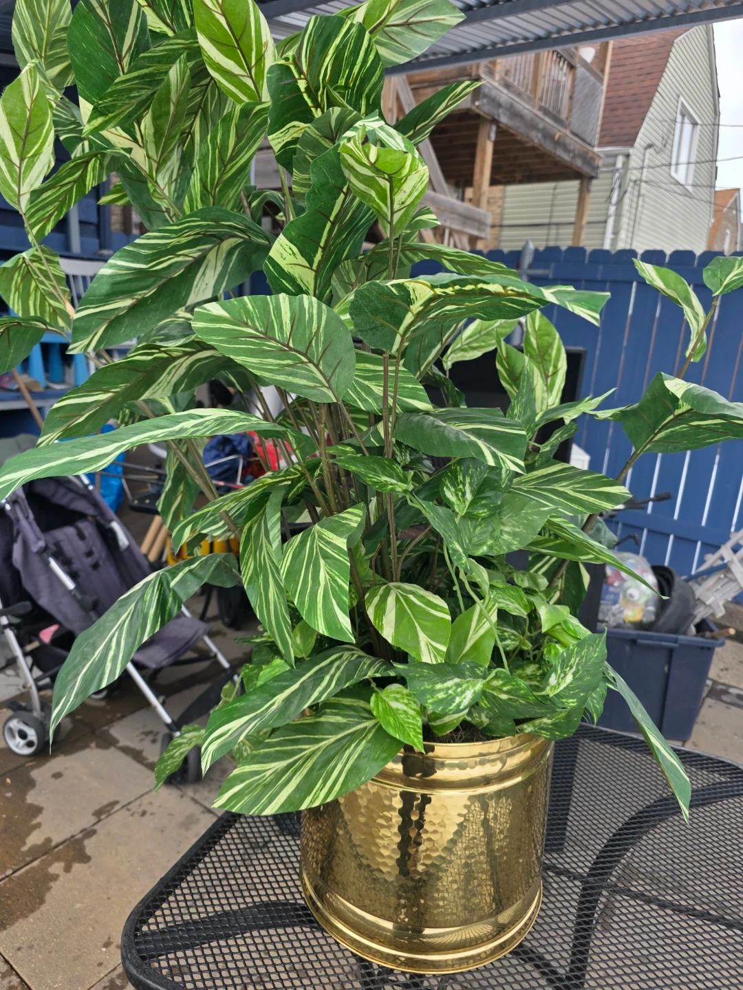 This is a large, lush tropical plant in a decorative gold pot. It's approximately 3.5 feet tall. The pot measures about 10 inches in diameter. It's a beautiful statement piece for any home or office!