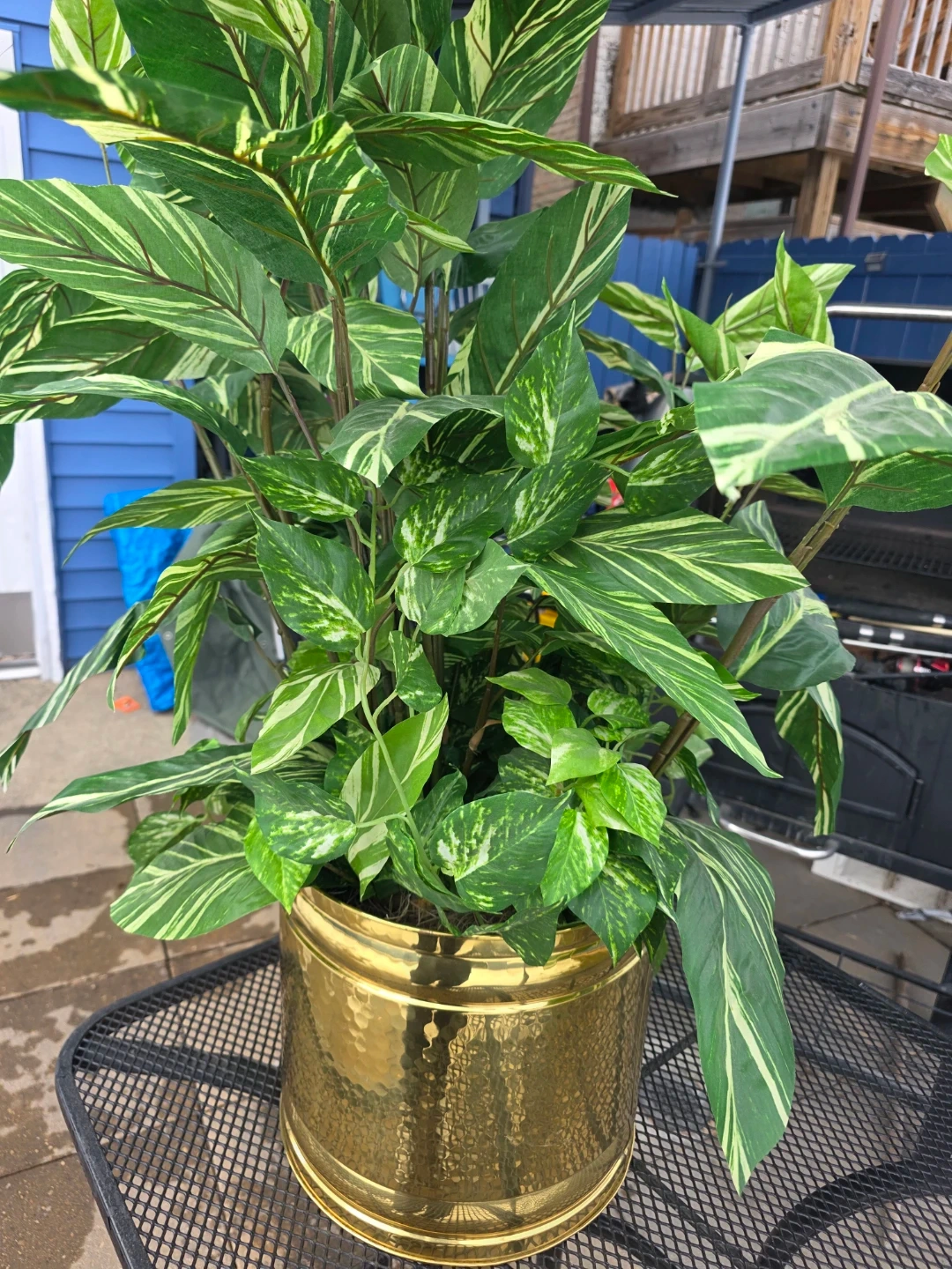 This is a large, lush tropical plant in a decorative gold pot. It's approximately 3.5 feet tall. The pot measures about 10 inches in diameter. It's a beautiful statement piece for any home or office!