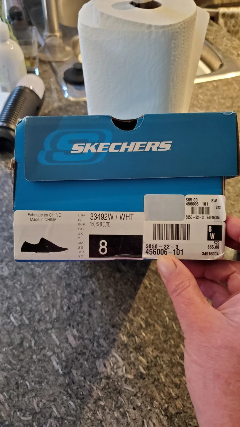 White canvas sneakers from BOBS from Skechers. They're a size 8 US Women's. The shoe features a patterned interior and a decorative sole with floral designs. Includes original box.