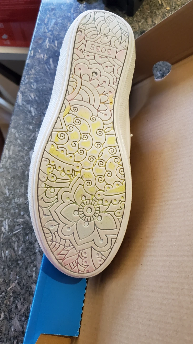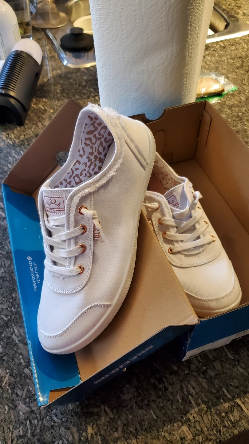 White canvas sneakers from BOBS from Skechers. They're a size 8 US Women's. The shoe features a patterned interior and a decorative sole with floral designs. Includes original box.