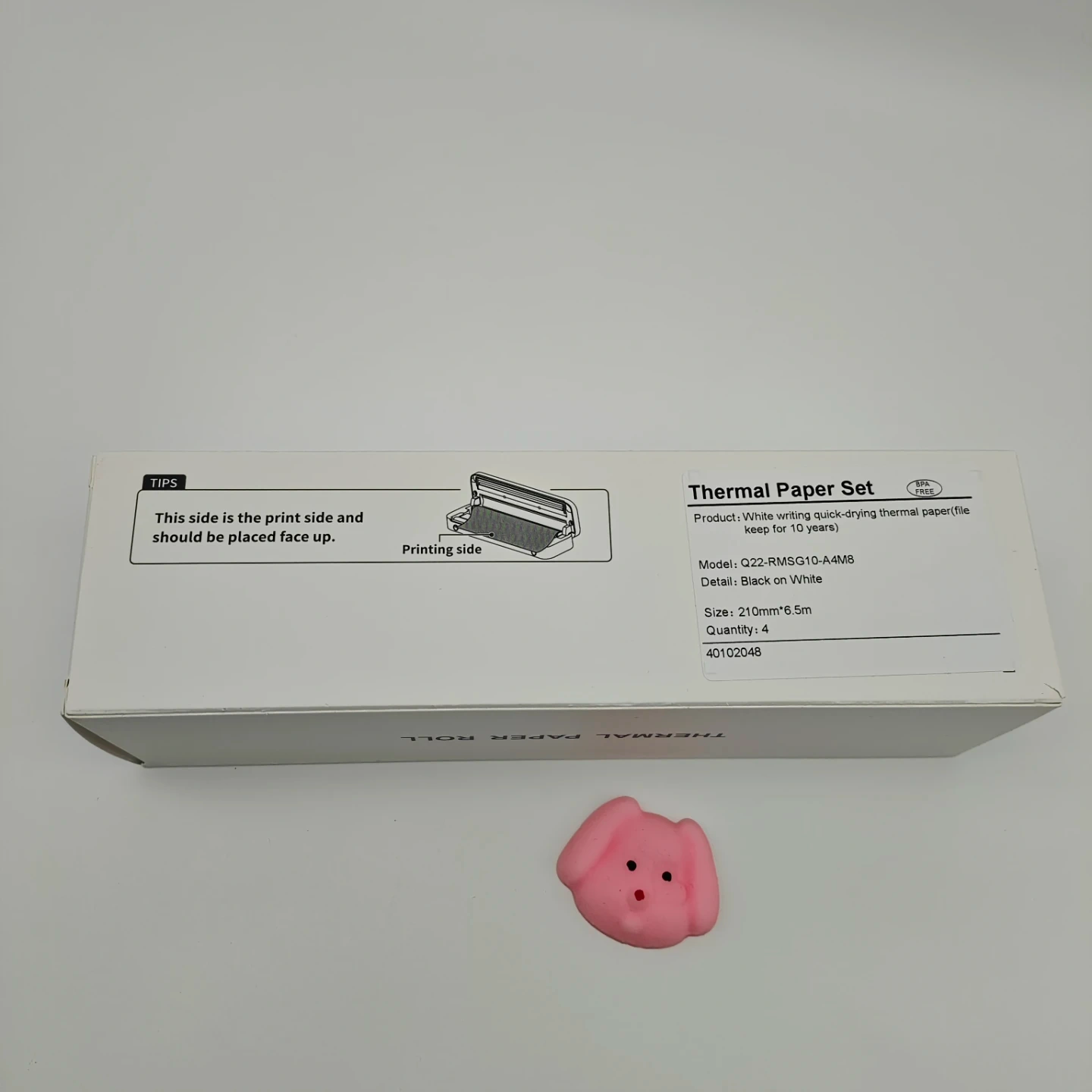 This is a thermal paper set. It is use for portable thermal printers. It comes with four rolls, each measuring 210mm by 6.5m. The paper is white and quick-drying, suitable for high-resolution printing. Keep for 10 years.