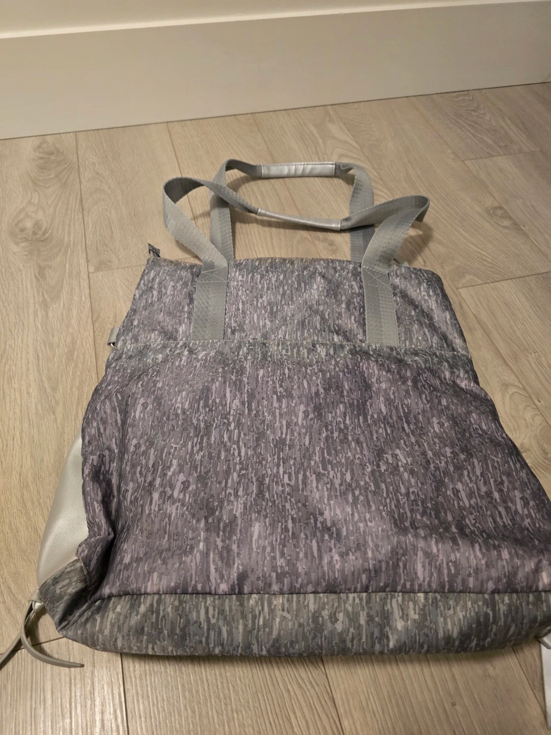 This tote bag features a unique grey and purple abstract print. It has two sturdy grey shoulder straps and a zippered top closure. Comes with a front zippered pocket, and zippers at either side so you can easily carry your yoga/pilates mat.