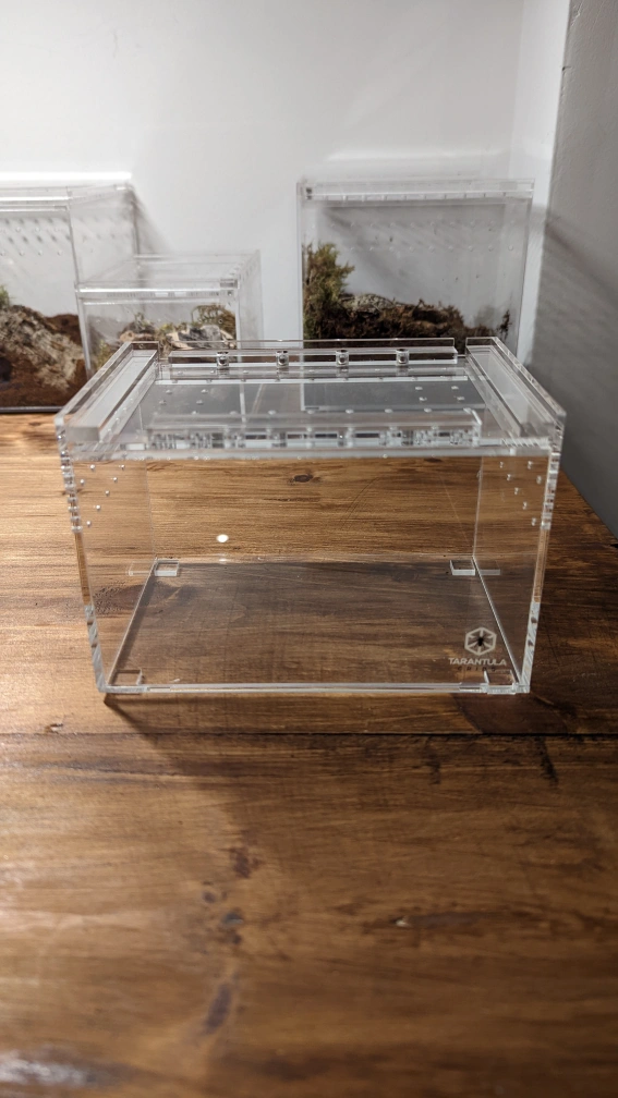 4x4x6 inch Tarantula cribs with sliding top and magnetic lock. These provide great ventilation, easy feeding and secure tops to avoid escapees!