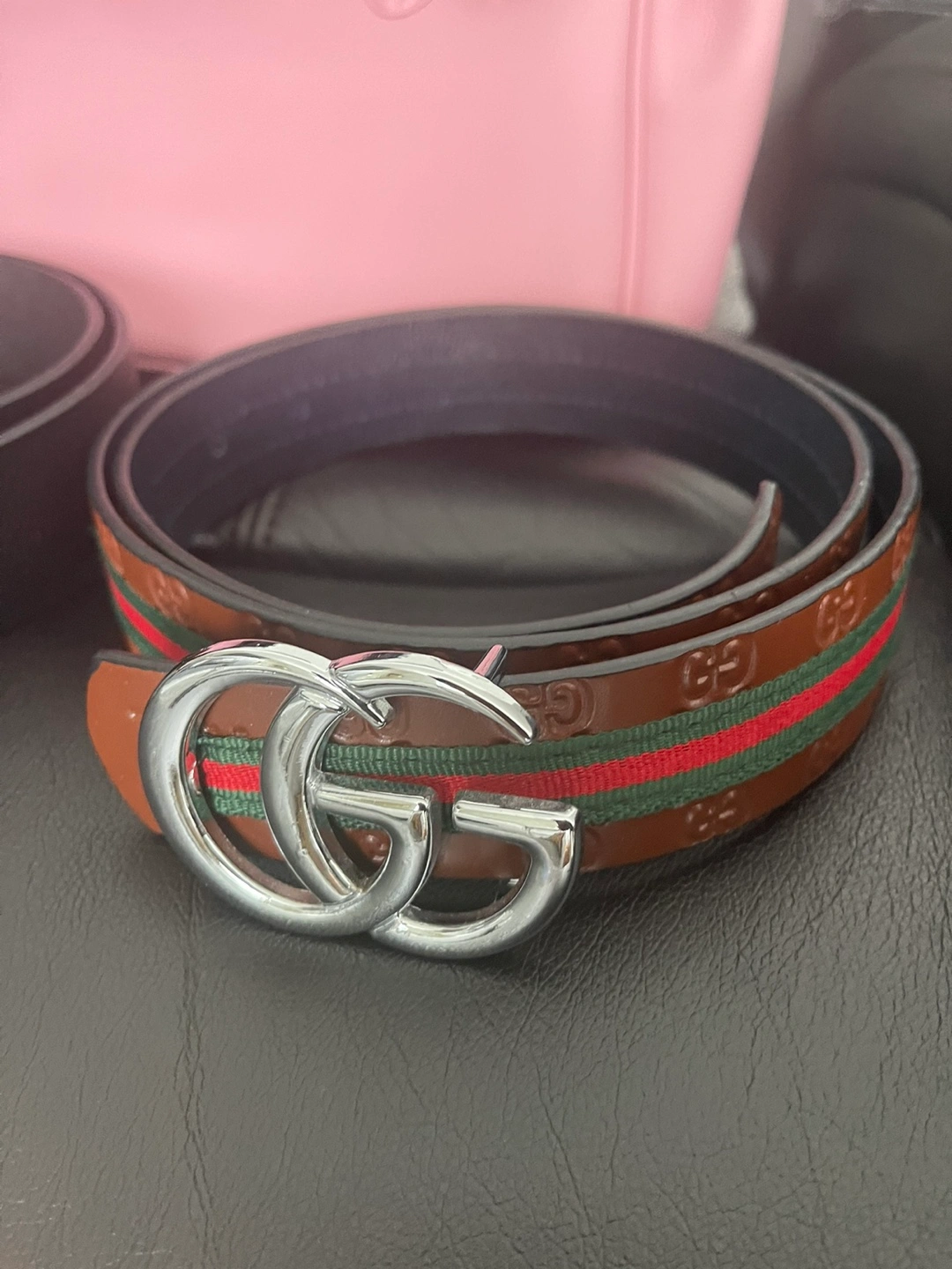 Brown leather belt. Features the iconic GG logo buckle. Red and green web stripe detail. Excellent condition.