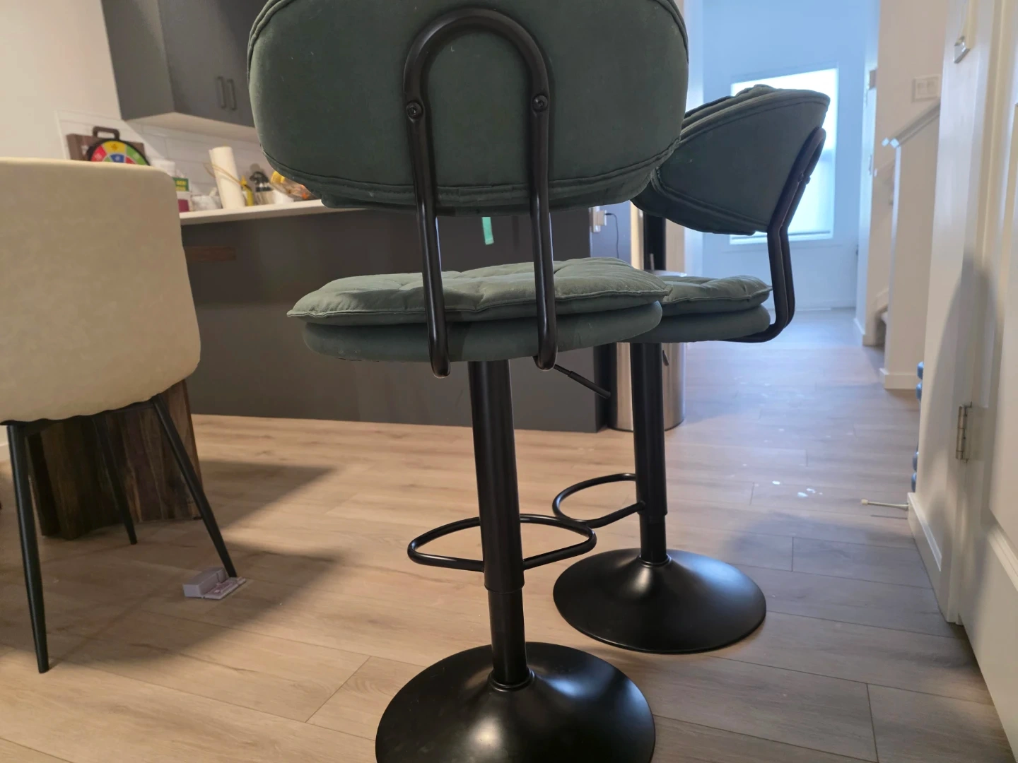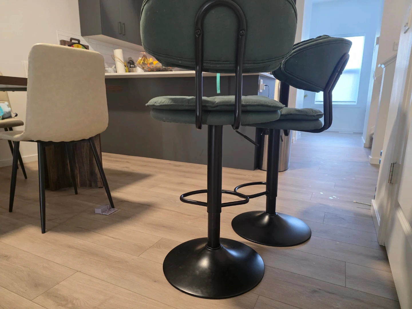 Selling a set of two green bar stools. They swivel and have cushioned seats and backs. These stools would be great for a kitchen island or home bar setup. The height is adjustable.