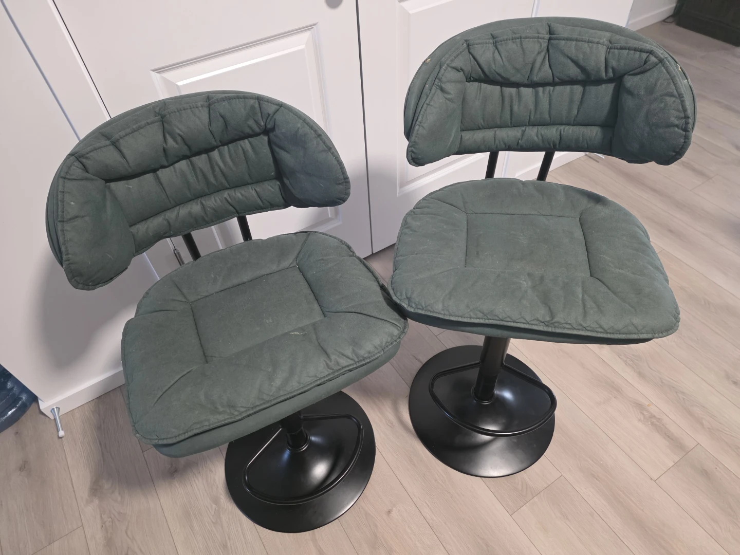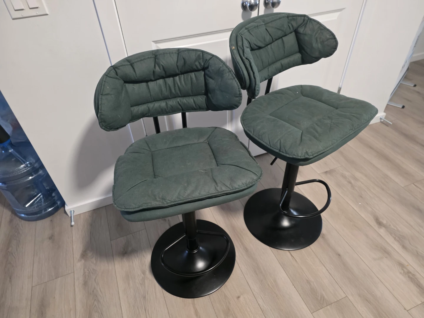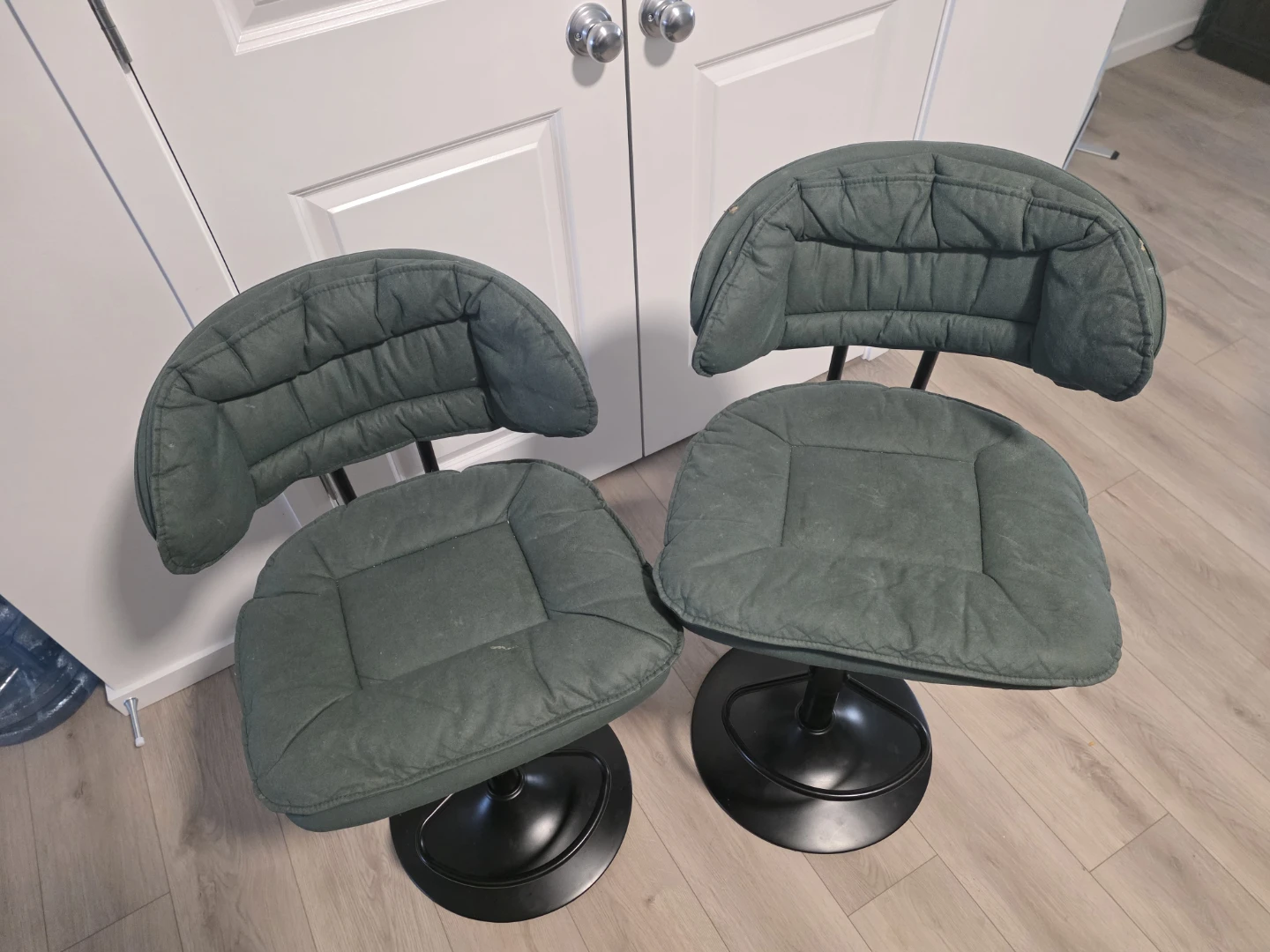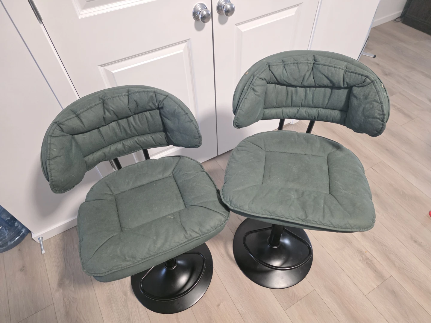 Selling a set of two green bar stools. They swivel and have cushioned seats and backs. These stools would be great for a kitchen island or home bar setup. The height is adjustable.
