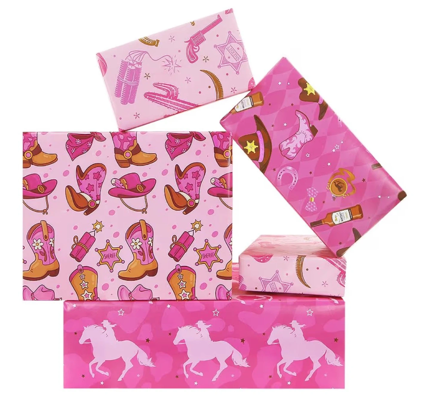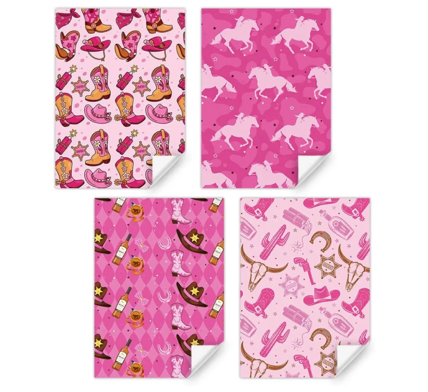 Western Wrapping Paper Cowgirl Boots Horseshoe Bull Cactus Wild West-theme Pink Gift Wrap Paper, 4 Pieces Folded Flat Art Paper for Girls Cowboy Birthday Wedding Baby Shower DIY Crafts Gift Packing
