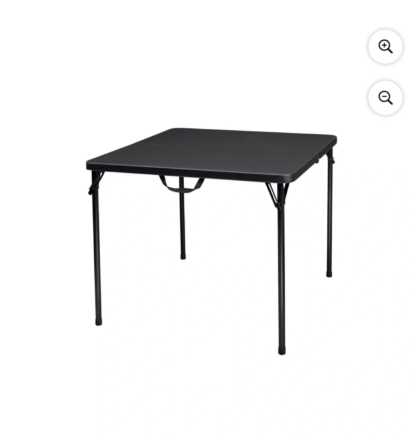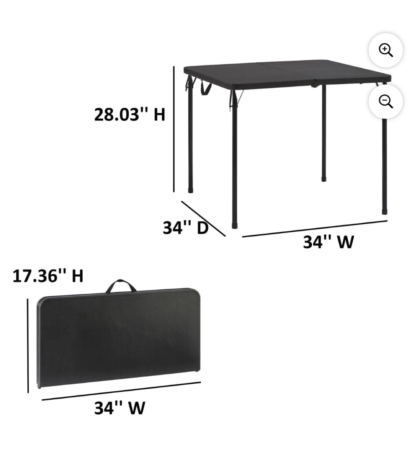 This is a black folding card table, perfect for games or extra surface space. It's a sturdy plastic top with metal legs that fold up for easy storage. The table measures 34 inches wide, 34 inches deep, and 28.03 inches high.