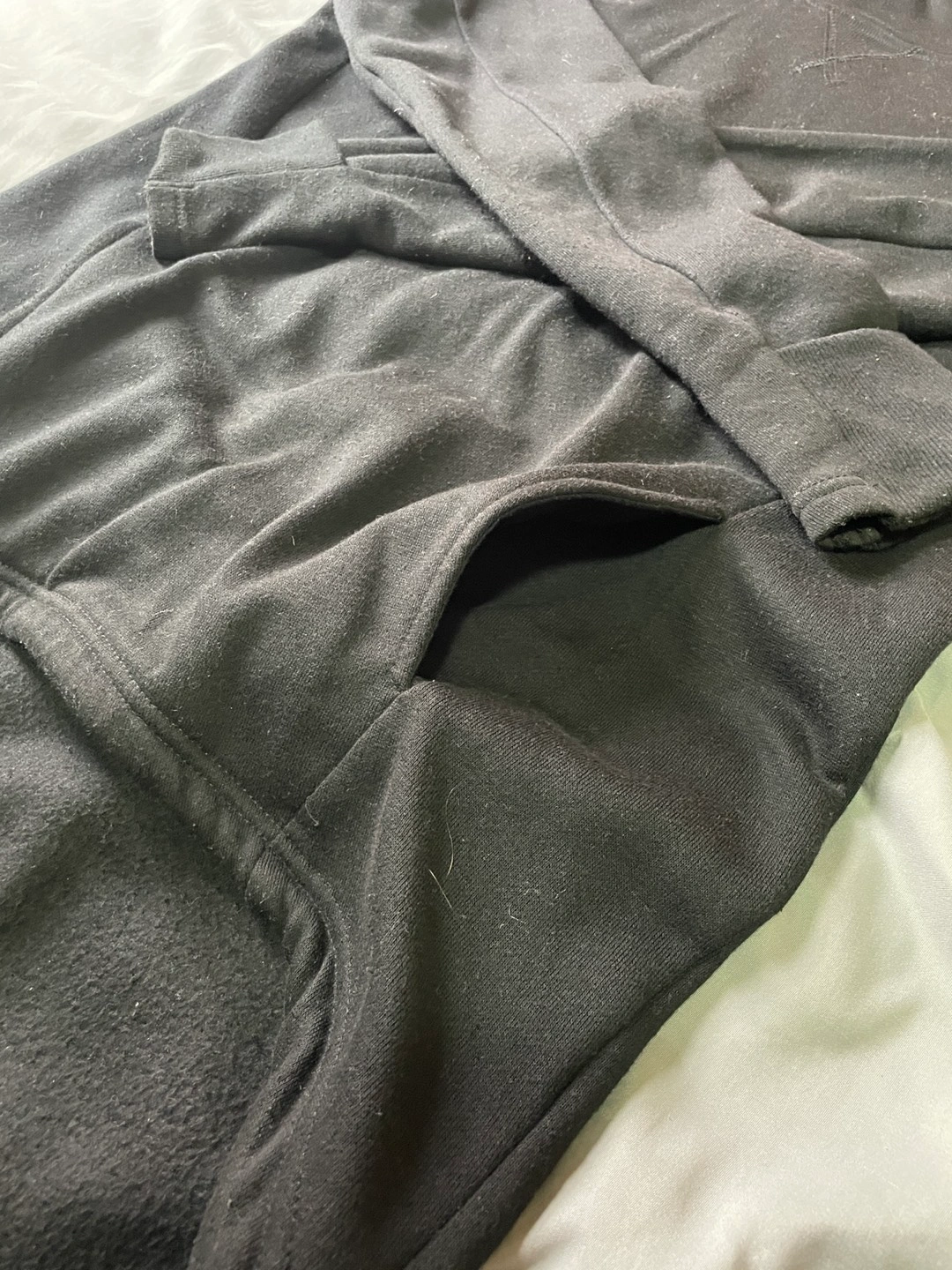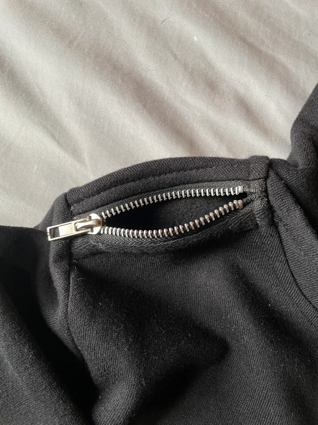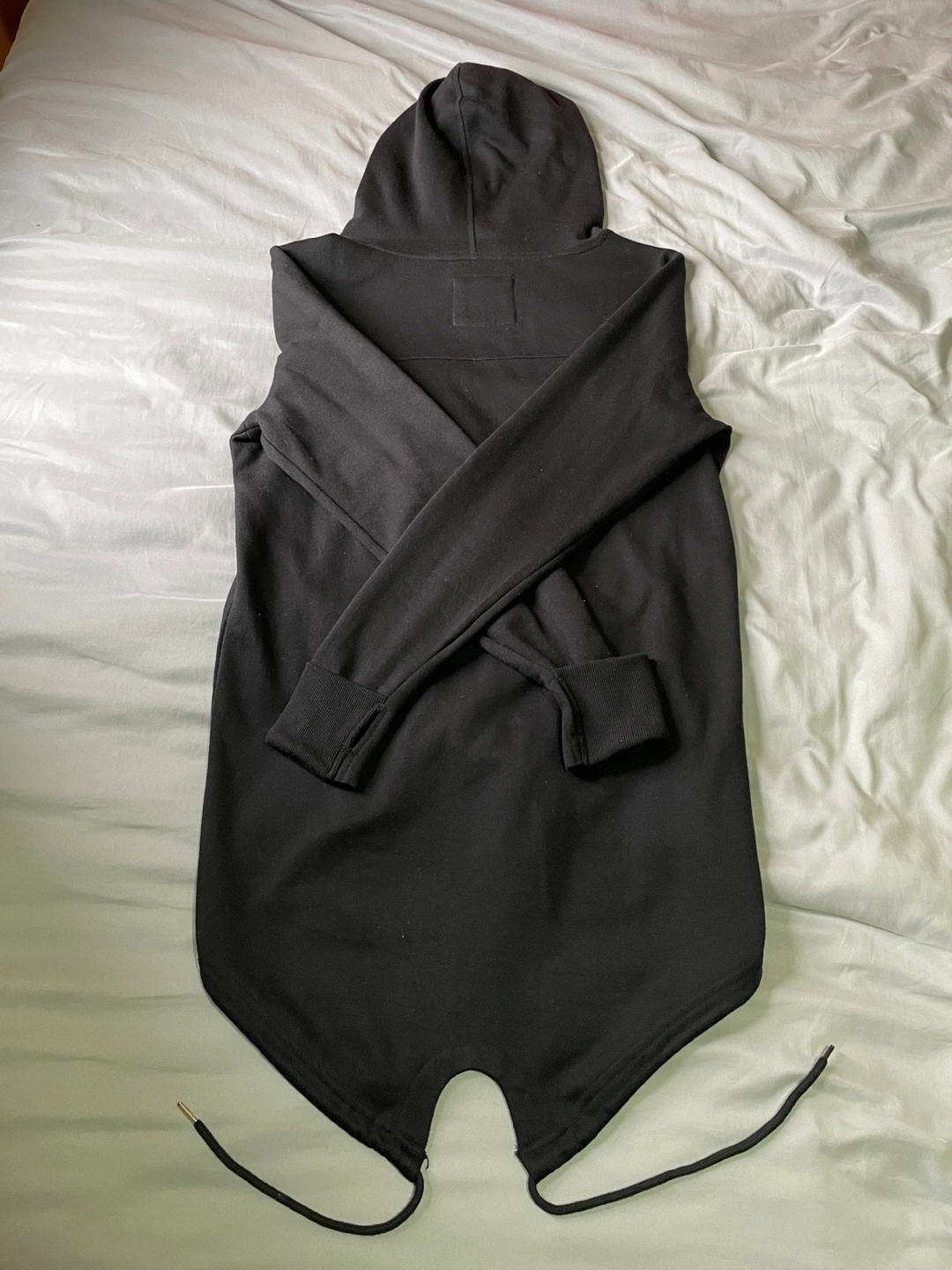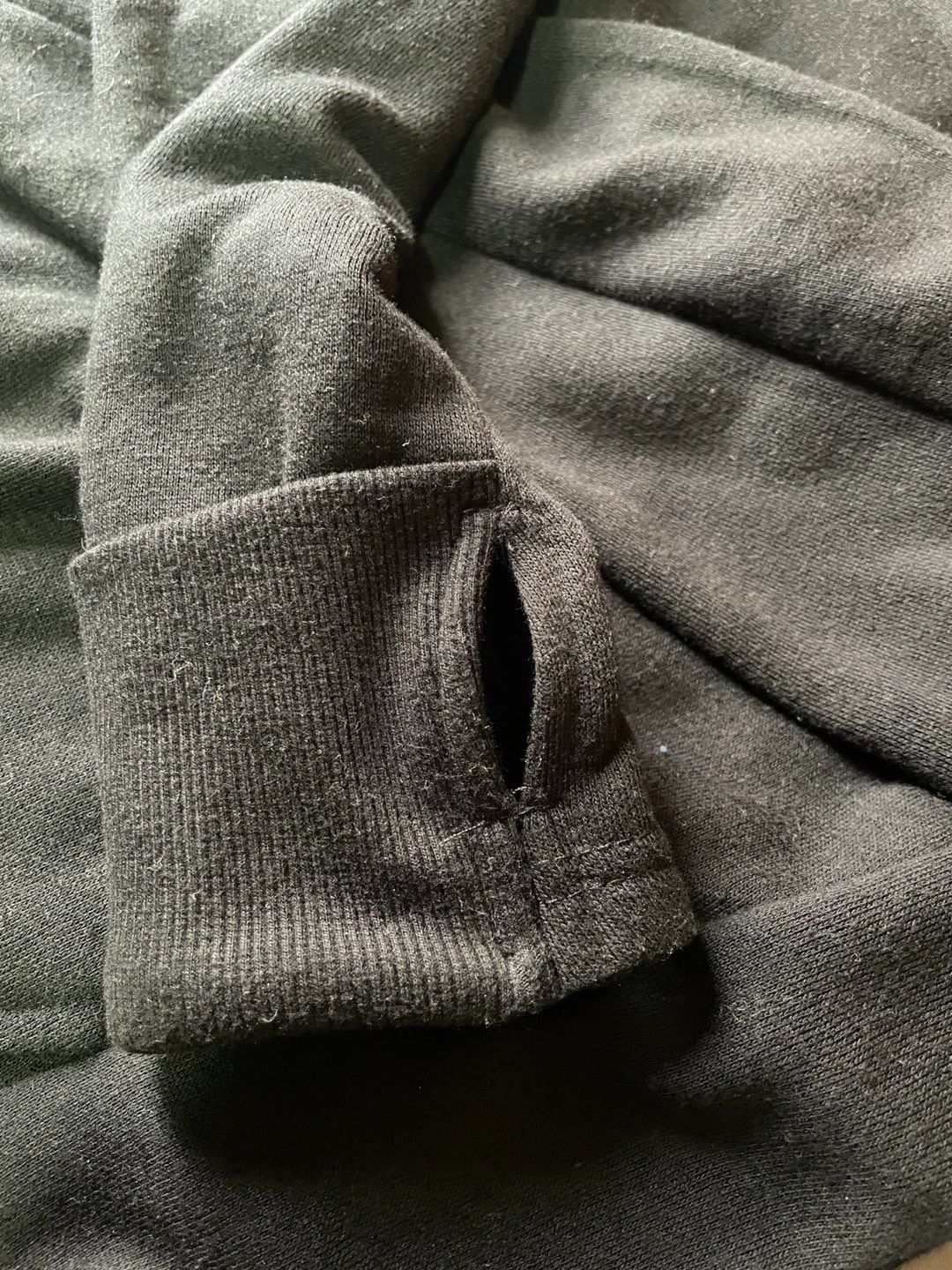 Black hoodie, extended back, front pocket, shoulder zipper, slits on sleeve for thumbs, small My cell: 647-286-1505