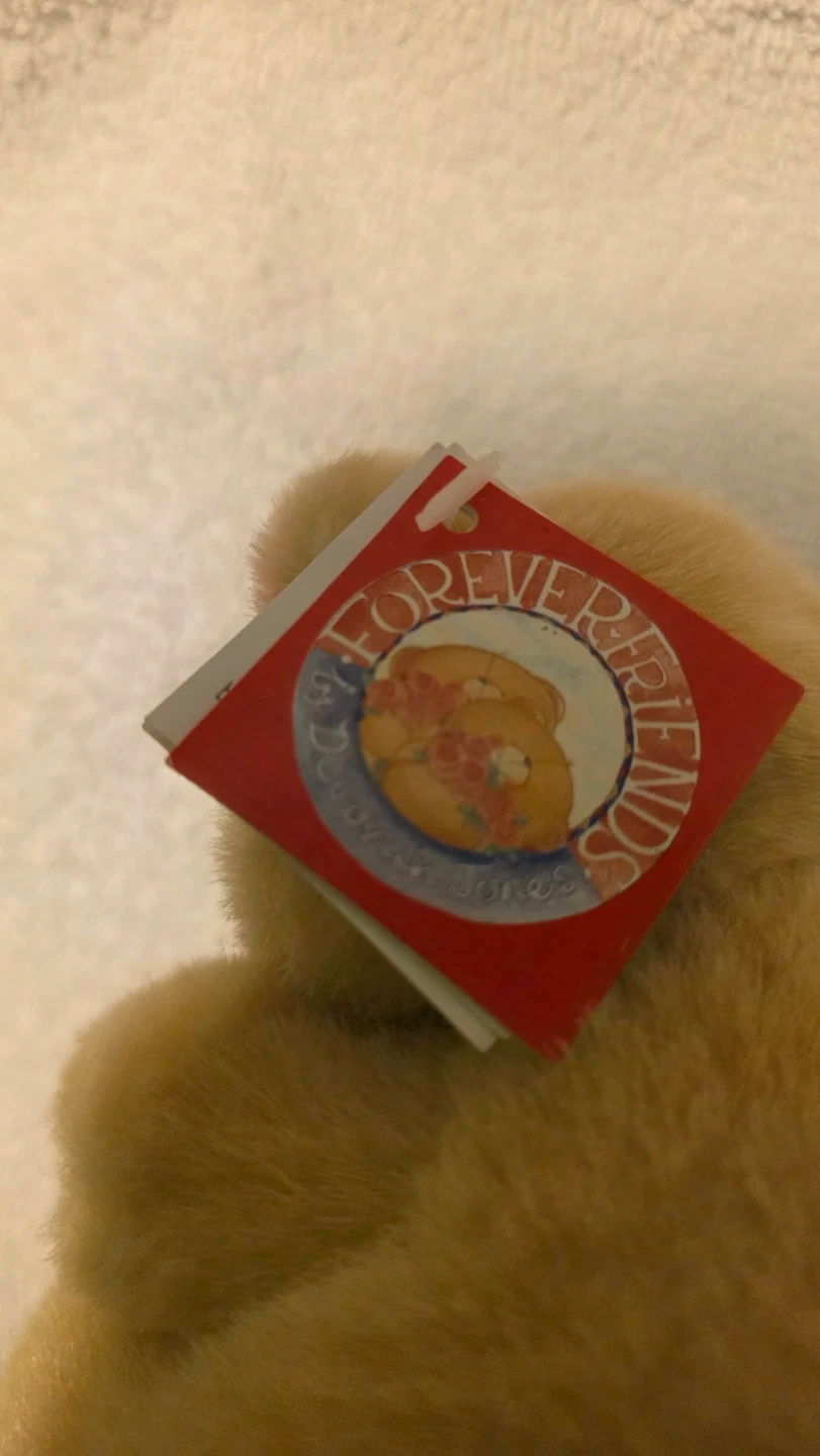 This is a cute teddy bear from the Forever Friends collection. It's holding an orange "S" with blue polka dots. It's handcrafted to meet safety requirements and is surface washable. This plush would make a nice gift for a child or collector!