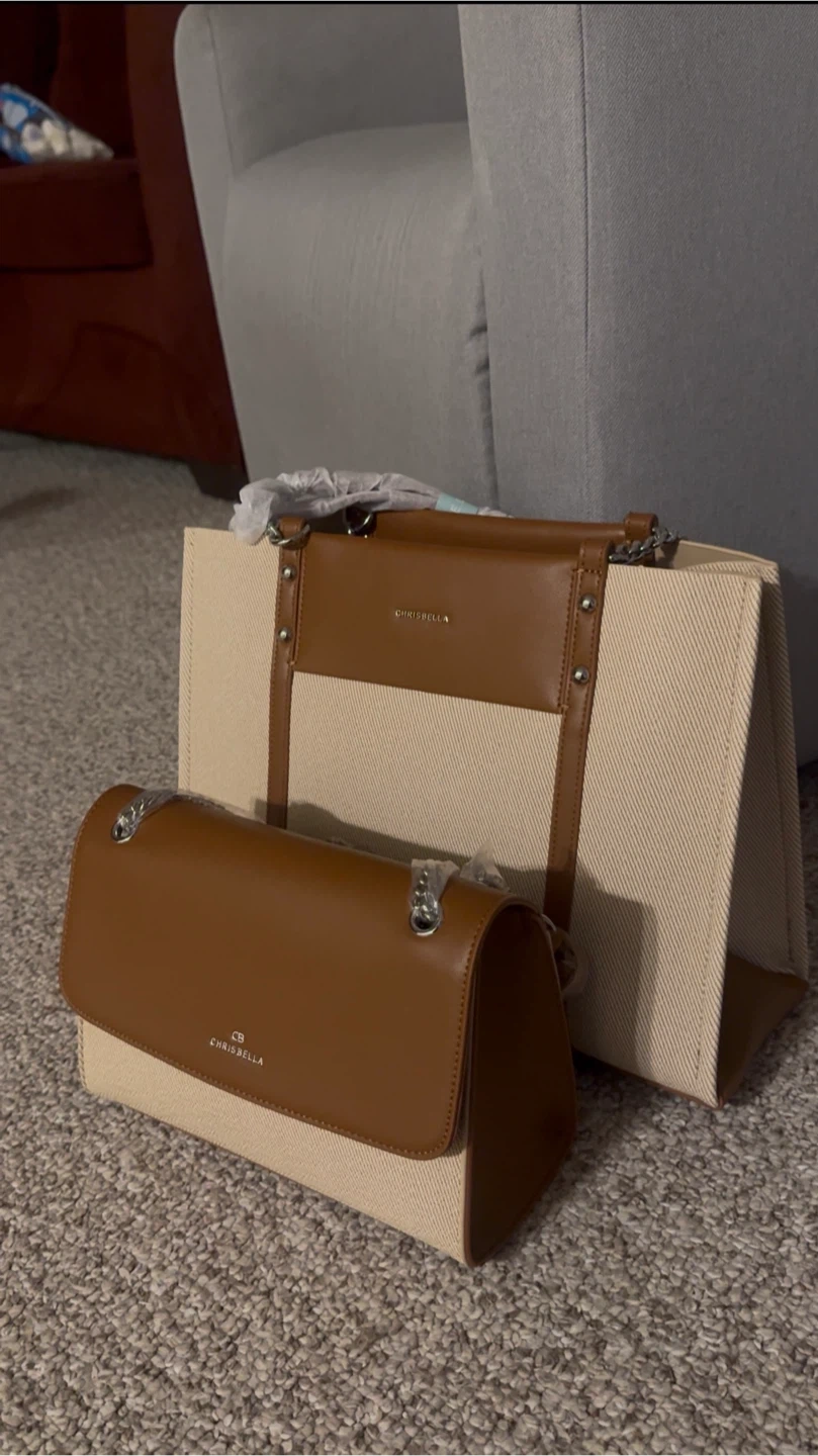 This set includes a beige canvas tote with brown faux leather accents and a matching brown faux leather crossbody bag. Both bags feature the CHRISBELLA logo. They're stylish and practical for everyday use.