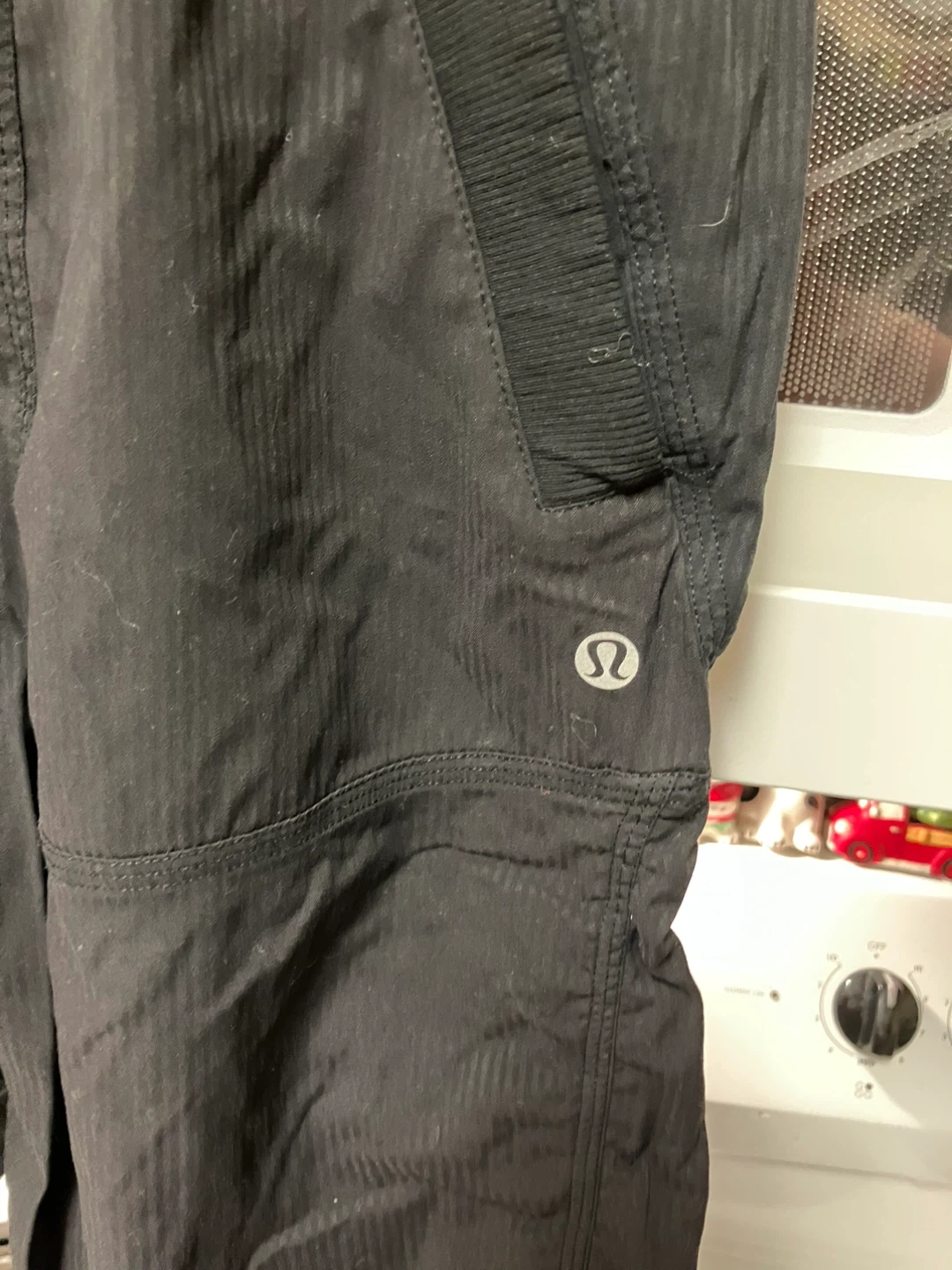 These Lululemon athletic capris are black with a subtle striped pattern. They feature a drawstring waist and a size 4 tag. Comfortable and versatile for various activities!