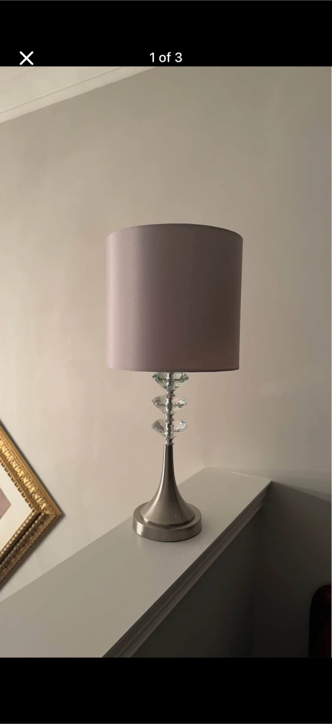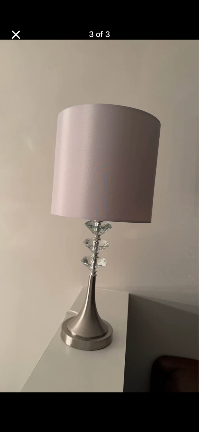 A lovely table lamp with a silver metal base and crystal accents. It has a light purple fabric shade and a spiral CFL bulb is included. It's perfect for adding a touch of style to any room!