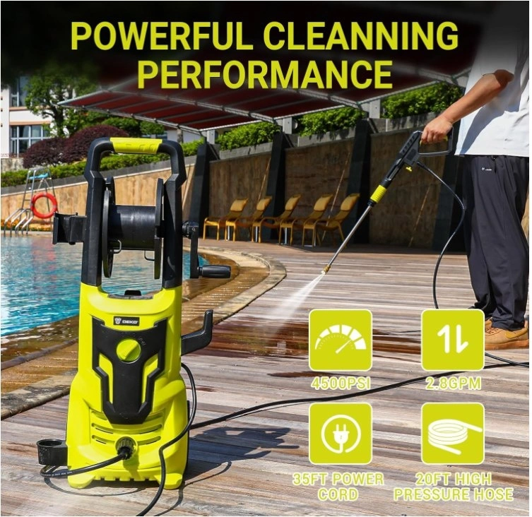 Brand new in box The electric pressure washer provides up to 4500PSI high pressure and 2.8GPM max water flow. Equipped with power washer gun, it can easily remove the dirt, suitable for many scenarios such as car washing, patio, driveways, concrete, pavements, boats and so on. DEKOPRO power washer equipped with 4 quick-connect nozzles (0°, 15°, 25°, and 40°) and foam cannon deliver different pressure could meet all your demand to clean every corner of your home and yard. Simply adjust the pressure for different washing tasks, suitable for both light, medium, or heavy-duty cleaning