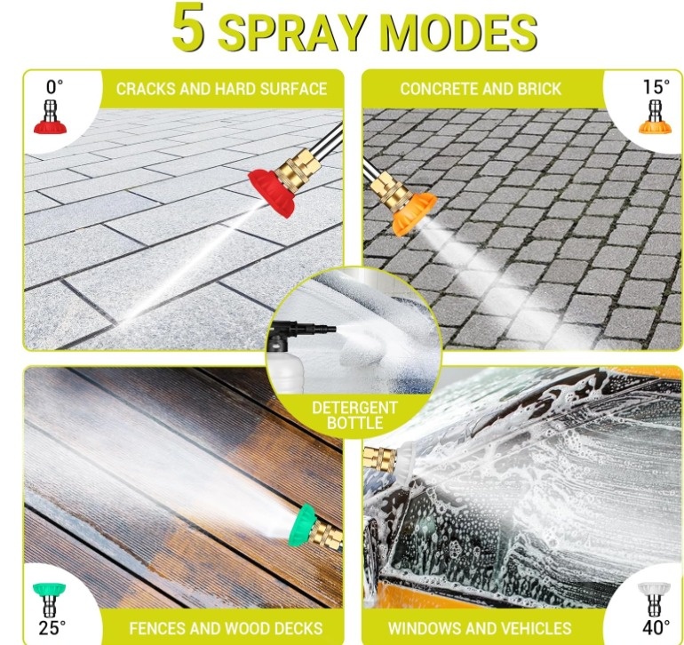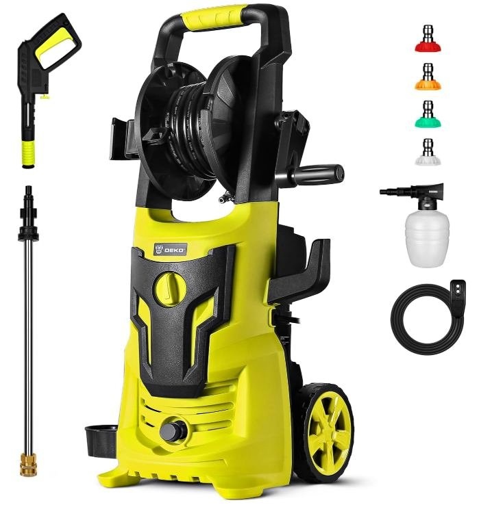 Brand new in box The electric pressure washer provides up to 4500PSI high pressure and 2.8GPM max water flow. Equipped with power washer gun, it can easily remove the dirt, suitable for many scenarios such as car washing, patio, driveways, concrete, pavements, boats and so on. DEKOPRO power washer equipped with 4 quick-connect nozzles (0°, 15°, 25°, and 40°) and foam cannon deliver different pressure could meet all your demand to clean every corner of your home and yard. Simply adjust the pressure for different washing tasks, suitable for both light, medium, or heavy-duty cleaning