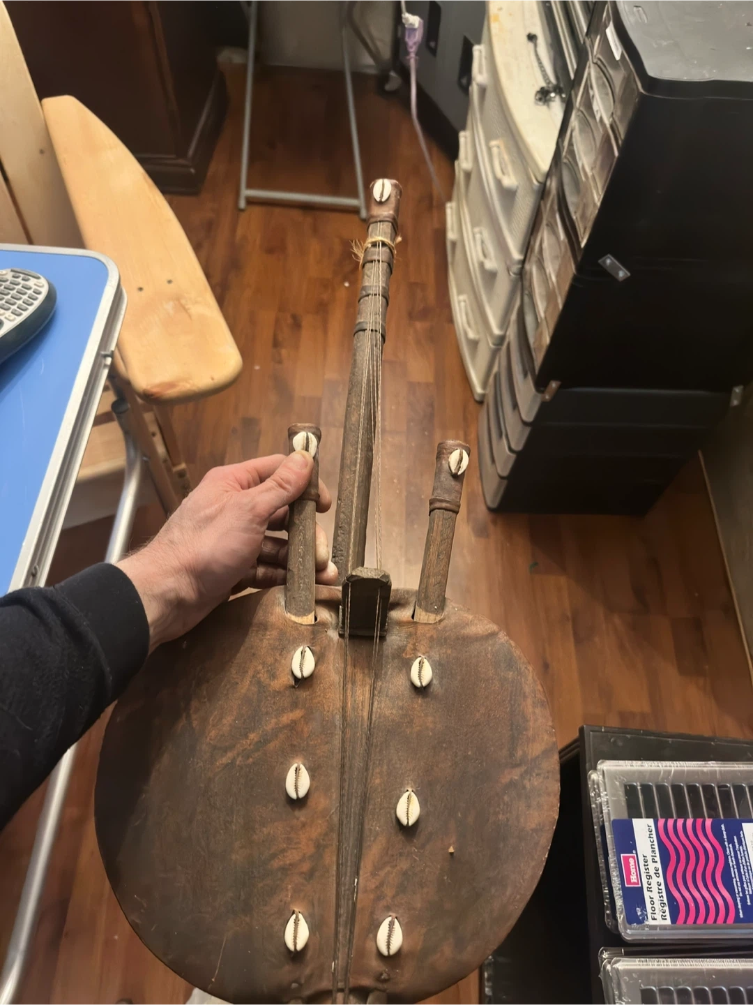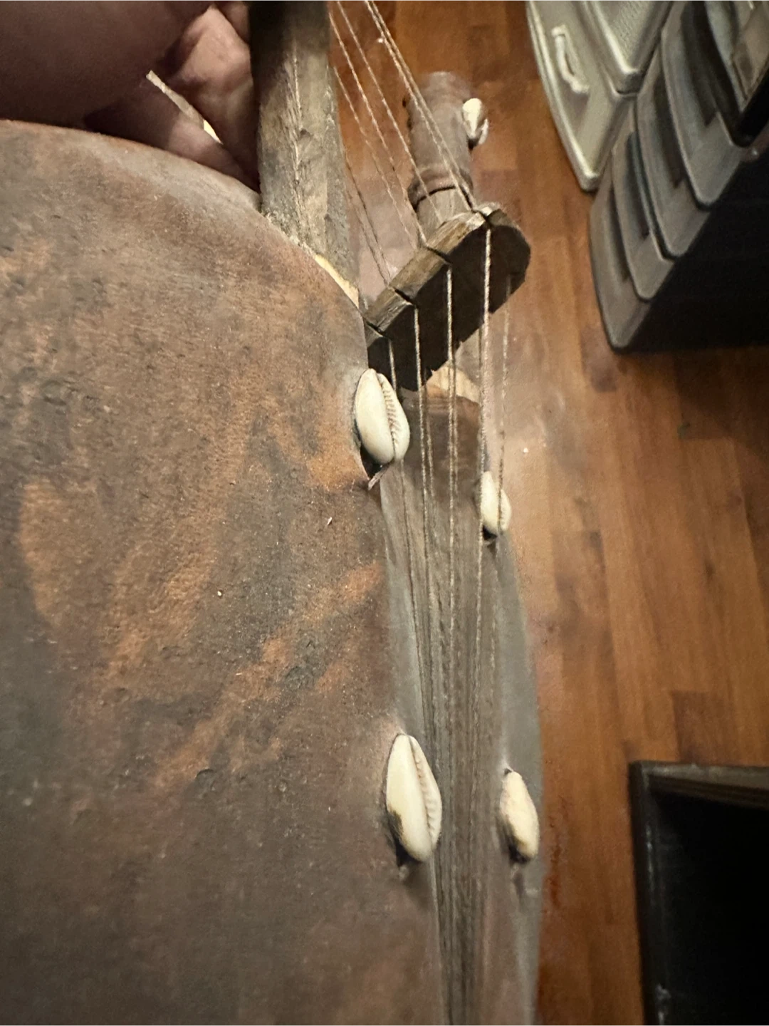 This is a vintage Kora, a traditional West African stringed instrument. It's made of wood and features decorative cowrie shells. This instrument has a unique sound and cultural significance.