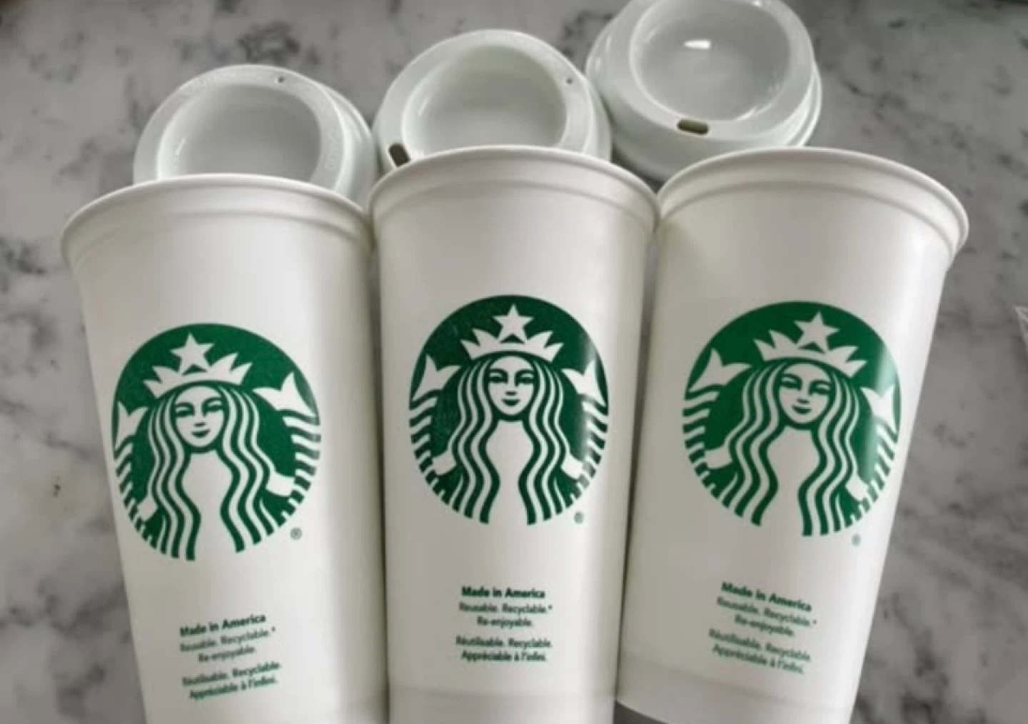 Three white Starbucks reusable cups with the iconic green logo. These cups are made in America and are reusable and recyclable. They come with matching white lids.
