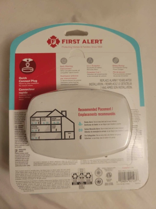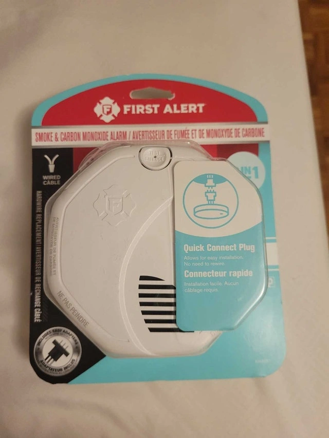 Selling a new First Alert hardwired combination smoke and carbon monoxide alarm with battery backup for your home's safety. These detectors provide crucial early warning and peace of mind. Features: Combination Smoke and Carbon Monoxide Detection, Hardwired with Battery Backup, Easy Installation, Reliable First Alert Technology. Cash accepted.