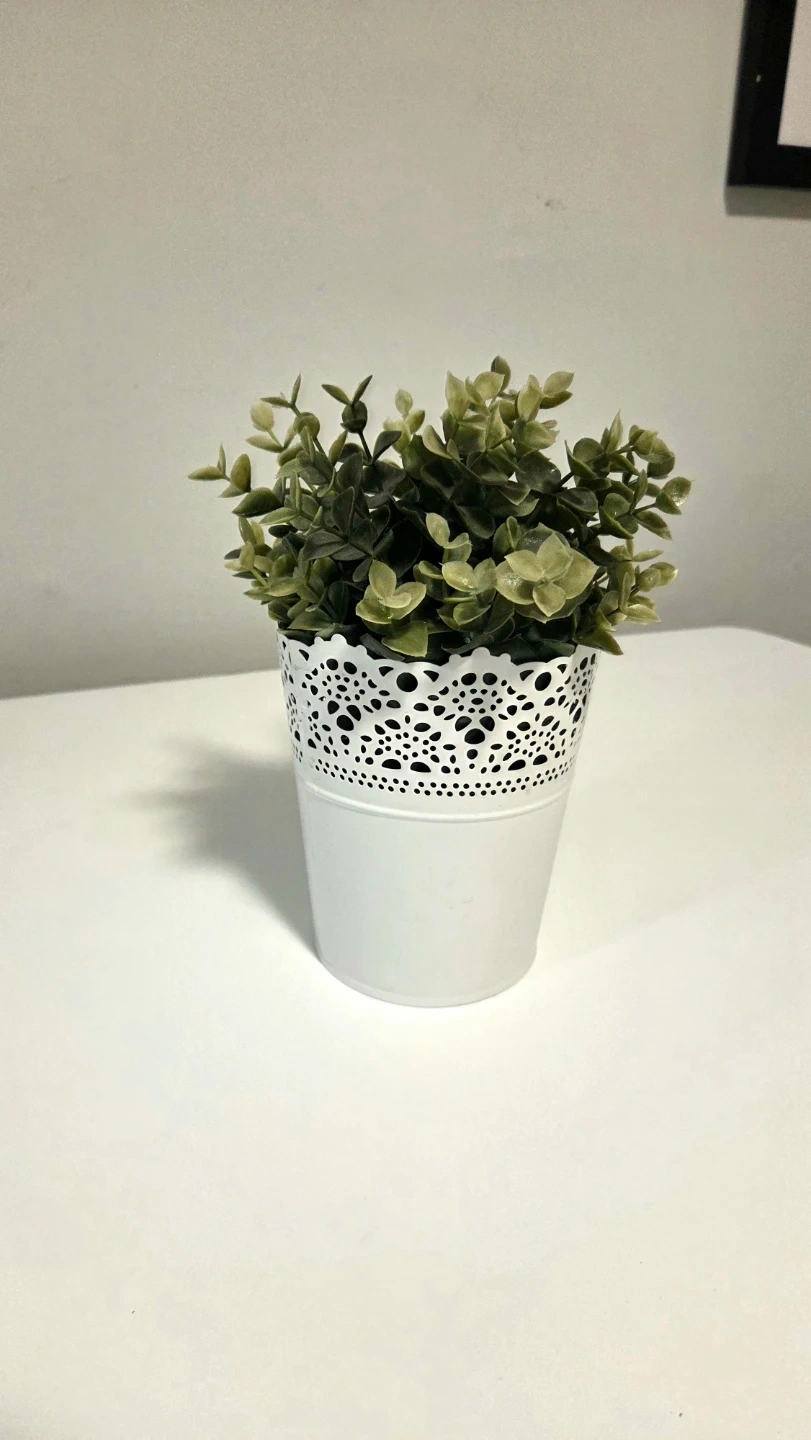 Here's a cute IKEA Skurar artificial plant in a white pot! It's in great condition and measures about 17 inches tall. The pot itself is about 4 1/4 inches in diameter. It's a nice little touch of greenery for any space