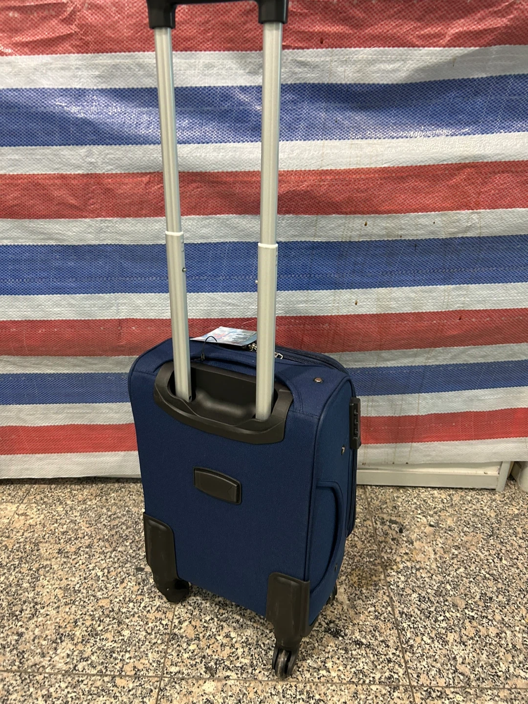 22 inch This is a navy blue rolling suitcase with red accents. It features a telescopic handle and wheels for easy transport. It's made of durable fabric and has multiple zippered compartments for organization. This luggage is perfect for weekend trips!