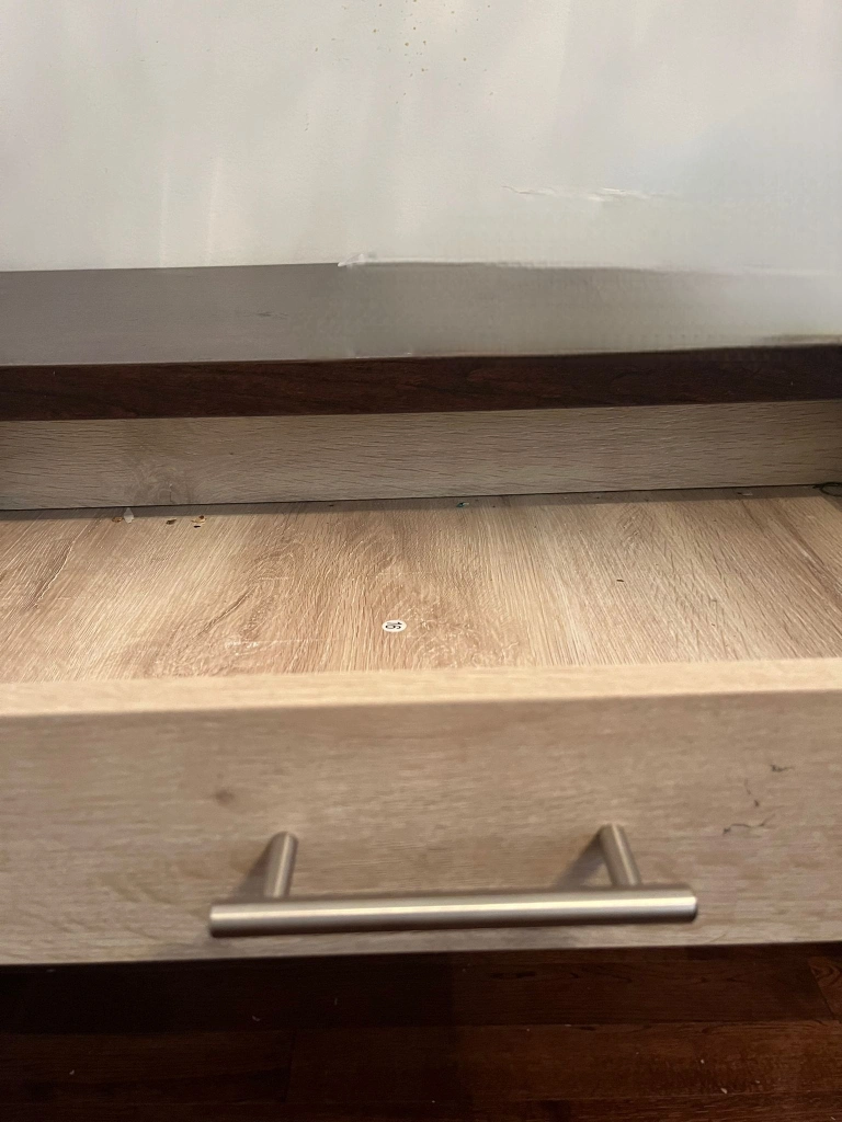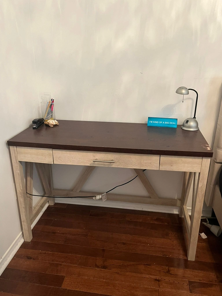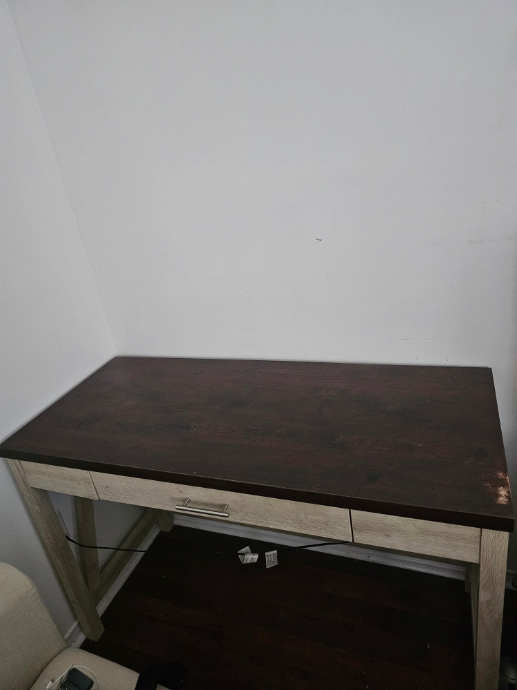 Selling a wooden desk with a dark brown top and light wood frame. It has a one drawer, perfect for a home office or study space. It's in good condition and ready for a new home