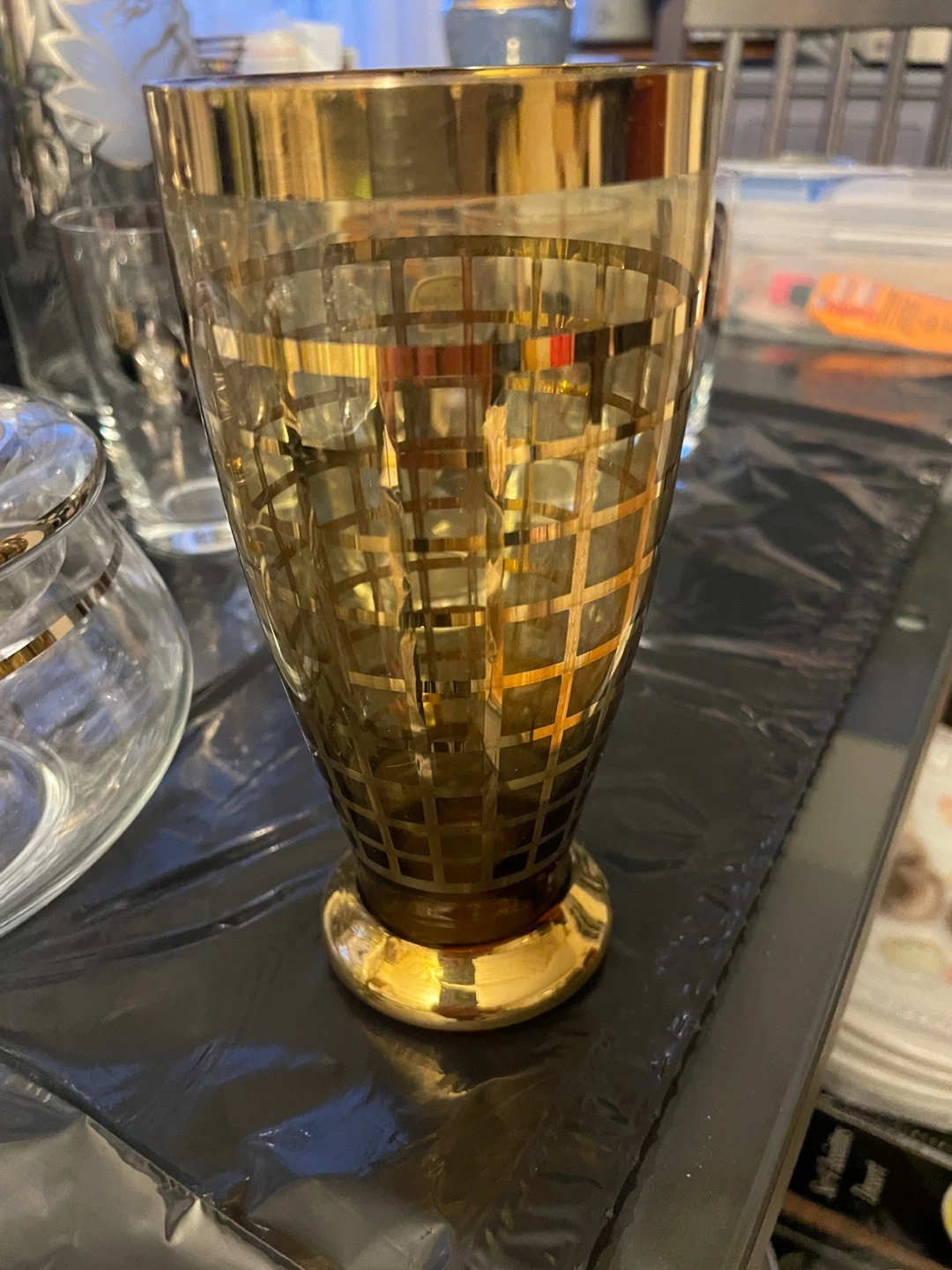Selling a vintage Bohemia pitcher and tumbler set featuring a stylish gold grid pattern. The set includes one pitcher and two tumblers, perfect for serving drinks in style. The gold accents add a touch of elegance to your table setting.