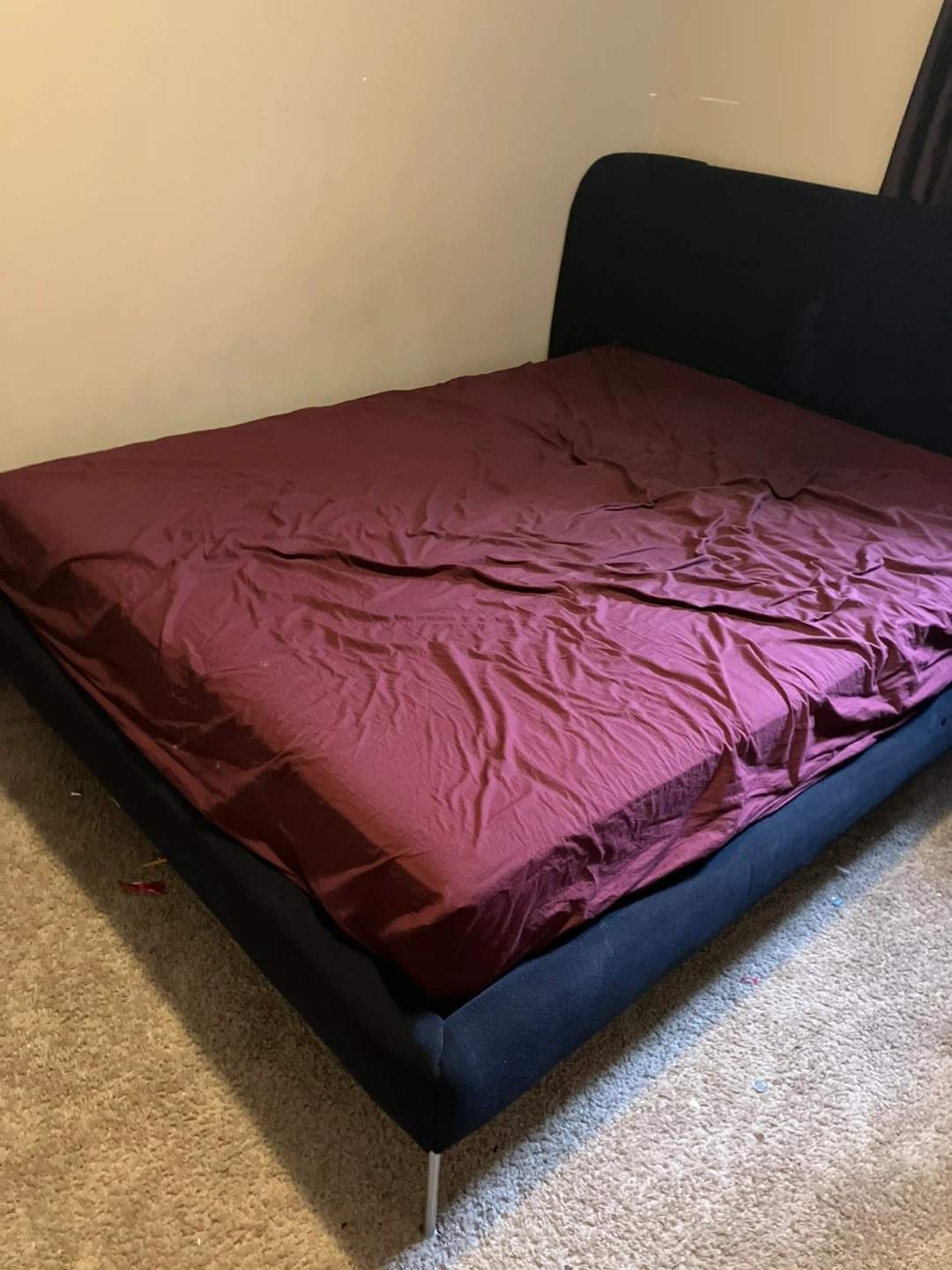 This is an IKEA TUF FJORD upholstered bed frame in queen size and black-blue colour. It has a curved headboard and sleek metal legs. The bed frame is made of a durable upholstered material.