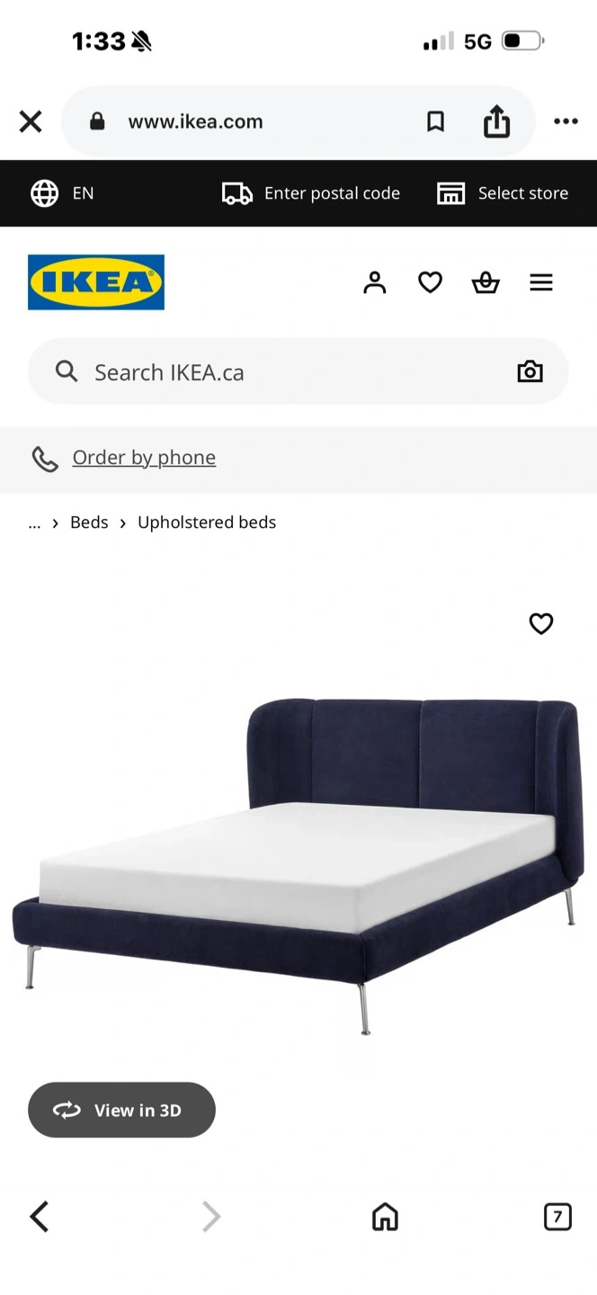 This is an IKEA TUF FJORD upholstered bed frame in queen size and black-blue colour. It has a curved headboard and sleek metal legs. The bed frame is made of a durable upholstered material.