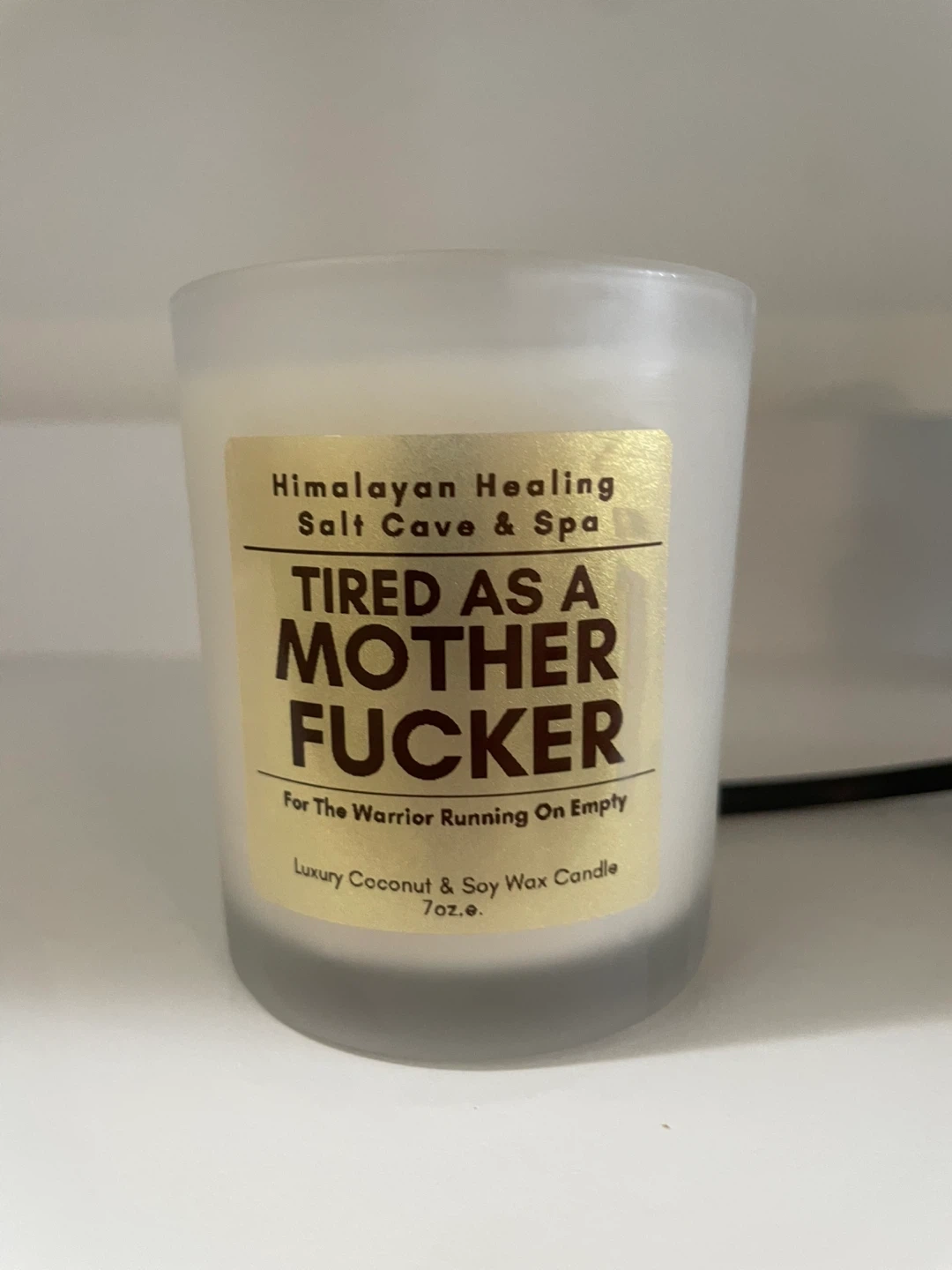 Himalayan Healing Salt Cave & Spa luxury coconut & soy wax candle. It's labeled 'Tired as a Mother F*cker' and is for the warrior running on empty.