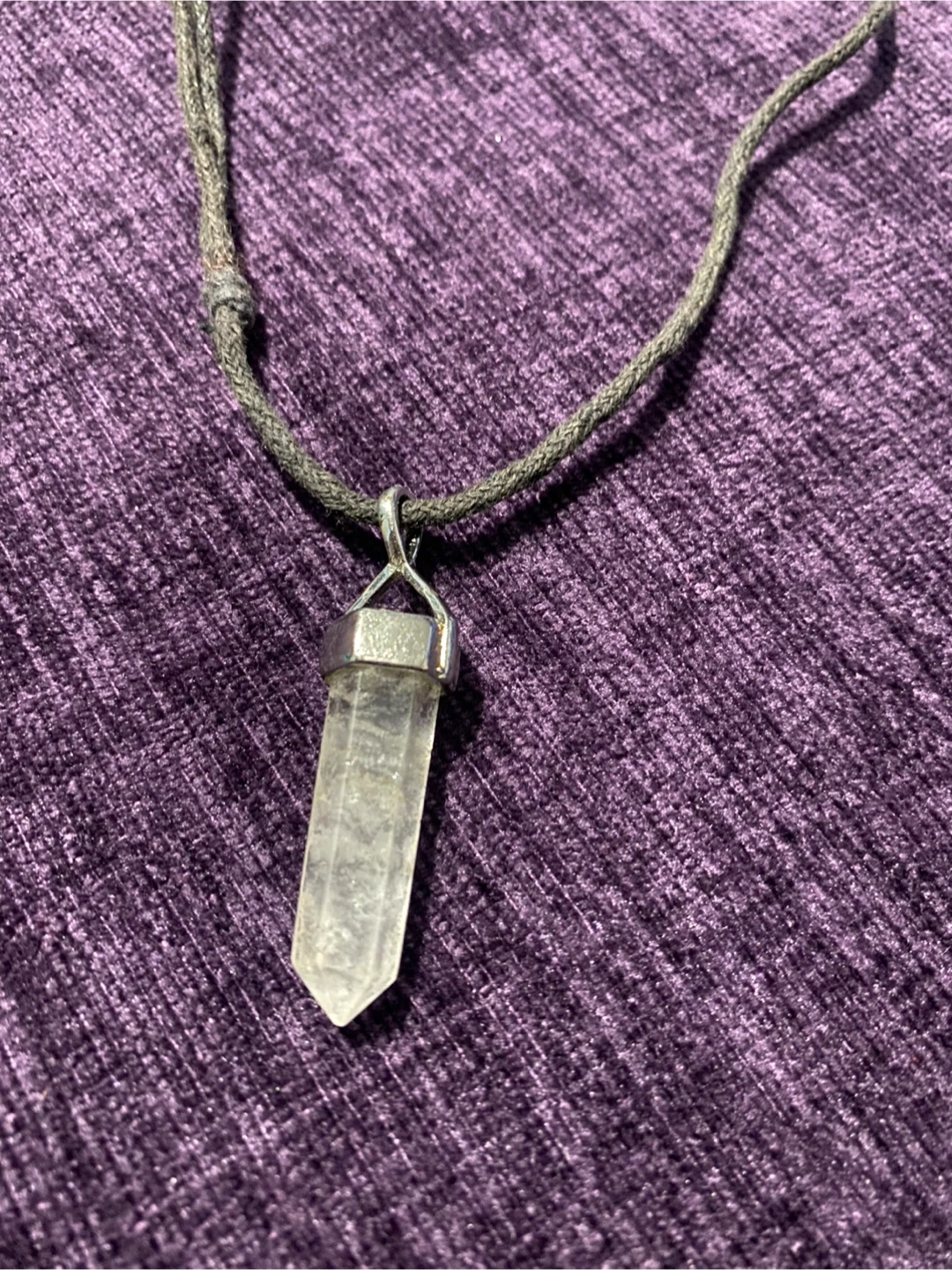 A clear crystal point pendant on a greyblack cord. The pendant is hexagonal and capped with silver-tone metal. It's adjustable for a comfortable fit.