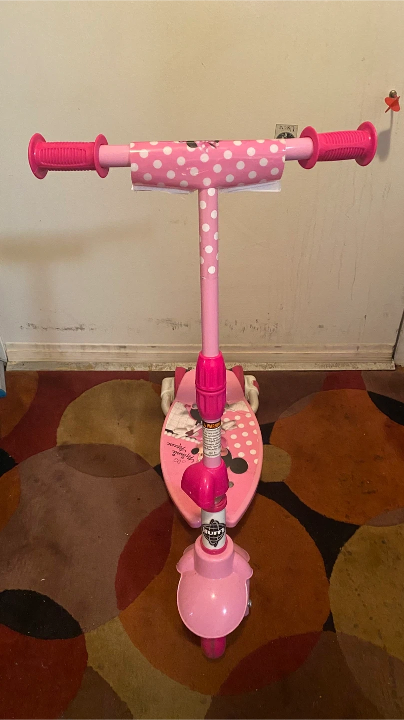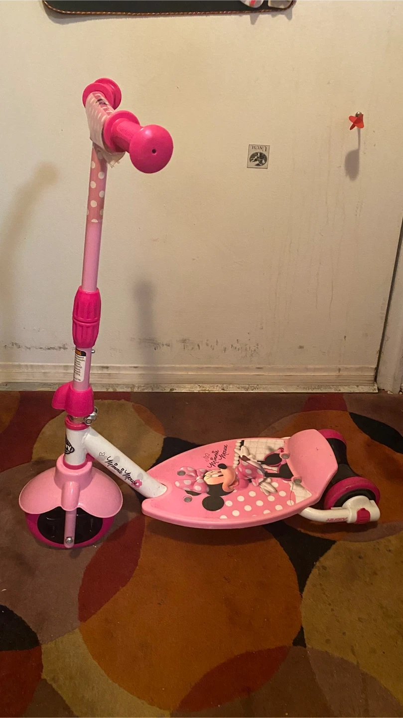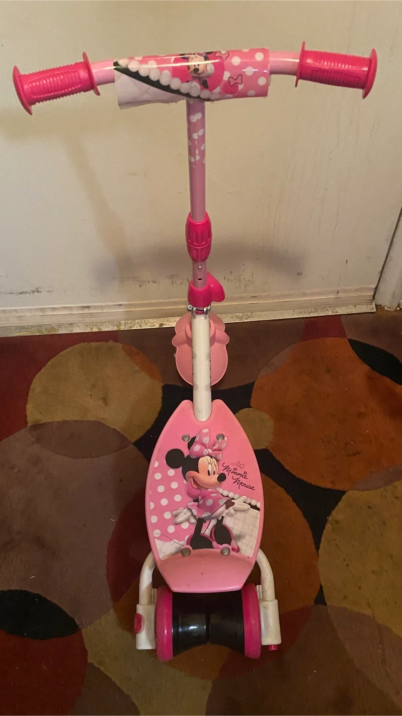 Selling a cute Minnie Mouse scooter! It's pink with white polka dots and features Minnie Mouse on the footboard. Perfect for little ones who love Disney!