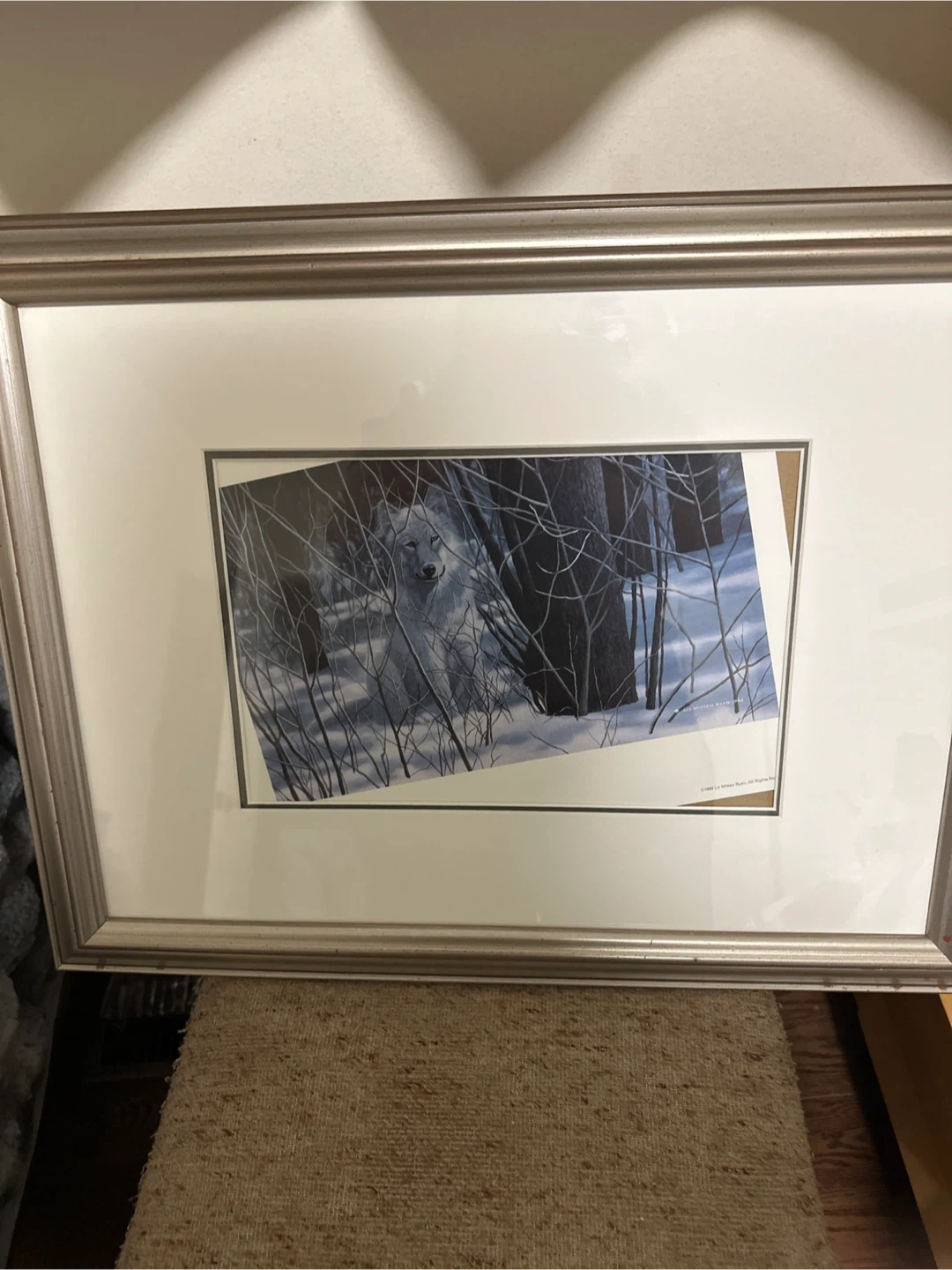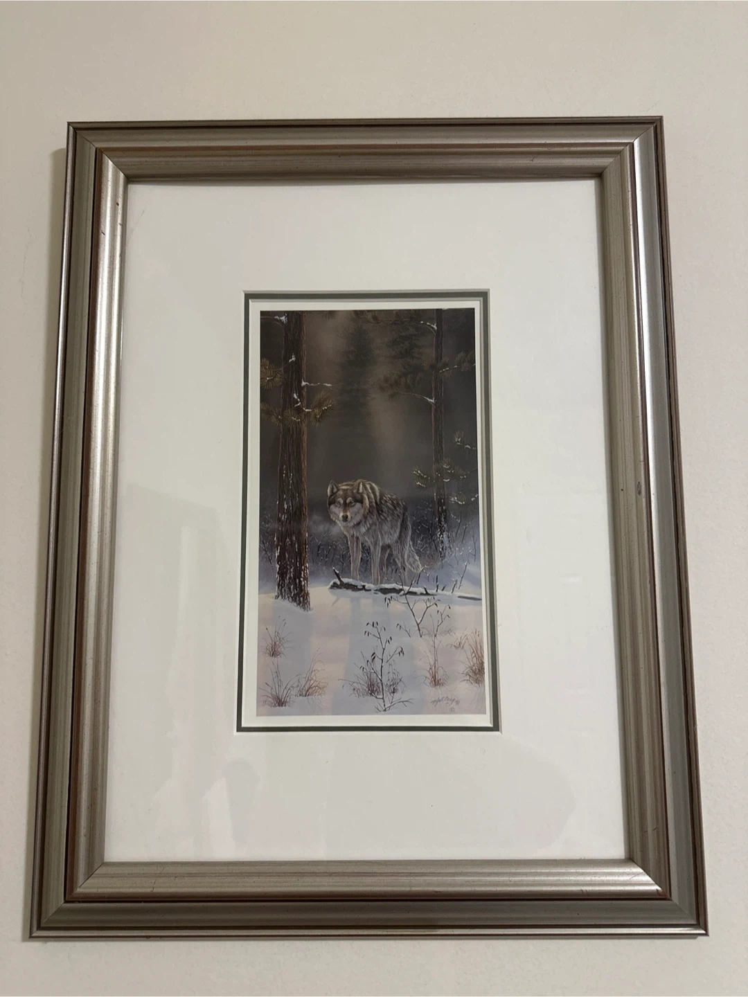 2 x Framed print featuring a wolf in a snowy forest setting. It's matted and ready to hang. This piece would look great in a den or rustic-themed room.
