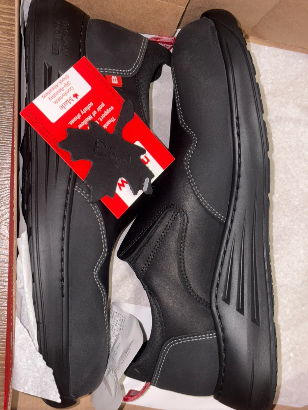 Selling a pair of Mellow Walk Motion men's composite toe slip-on safety shoes in black. They're brand new and come in the original box. Originally bought for $196 including taxes.