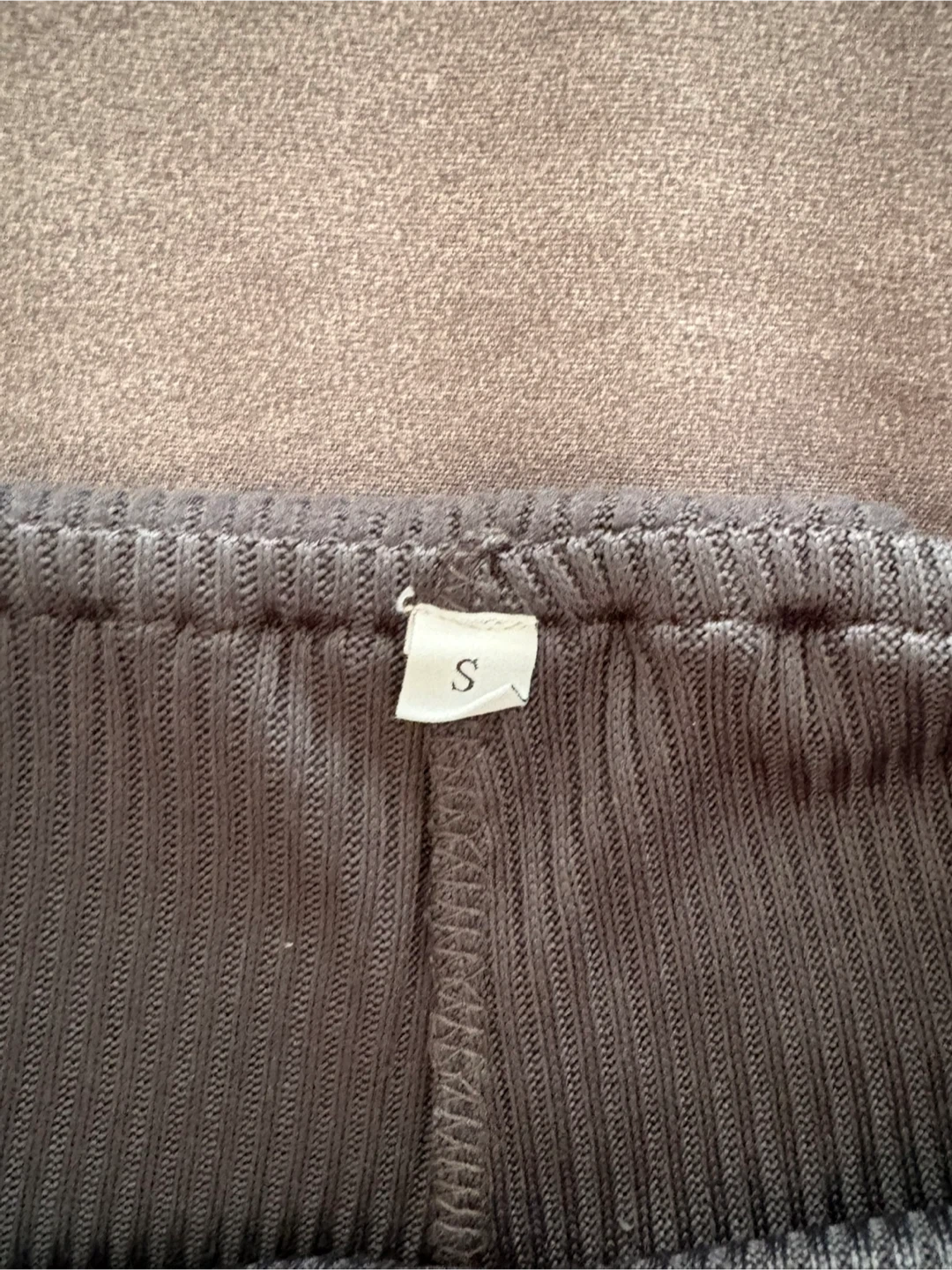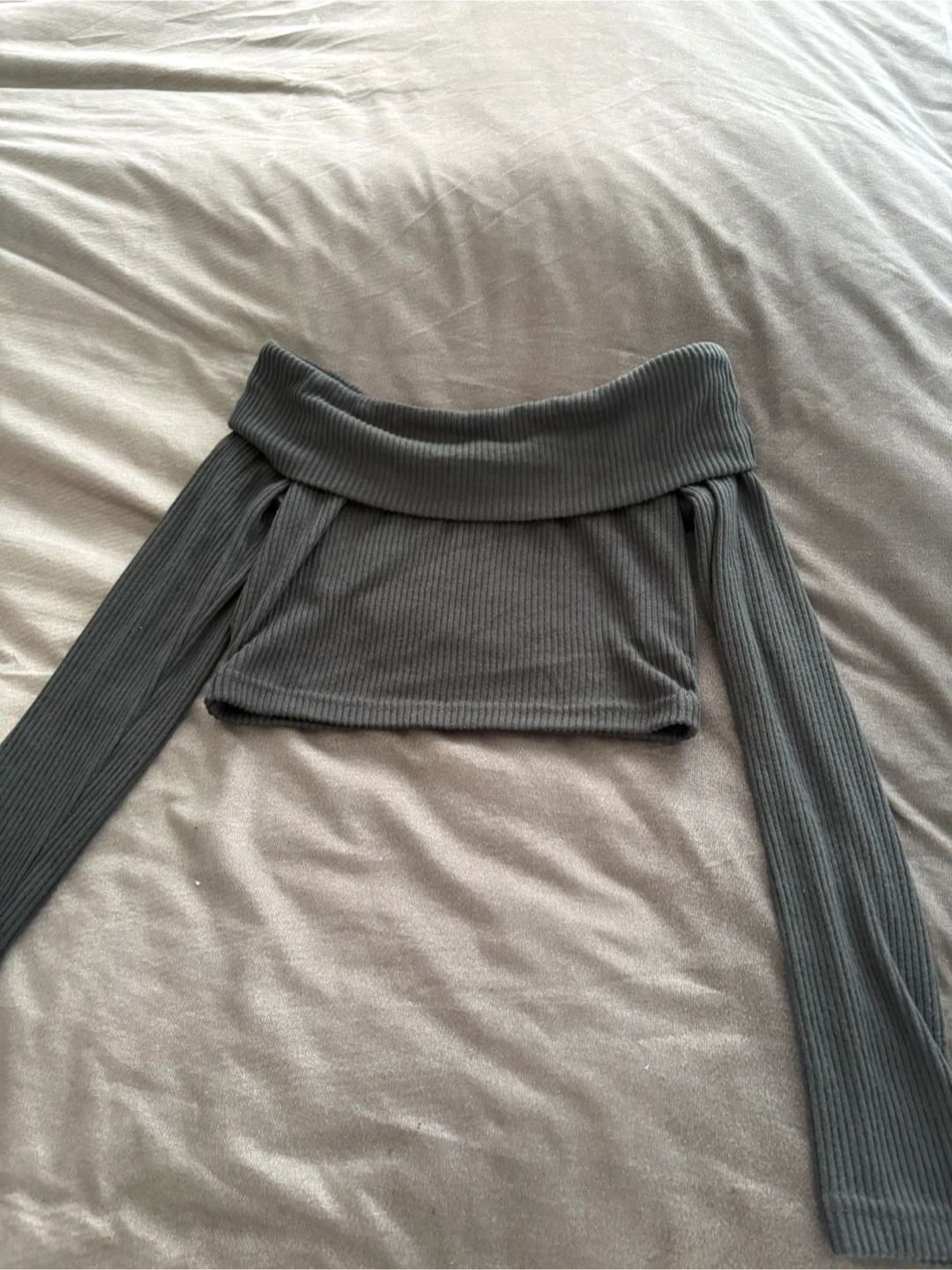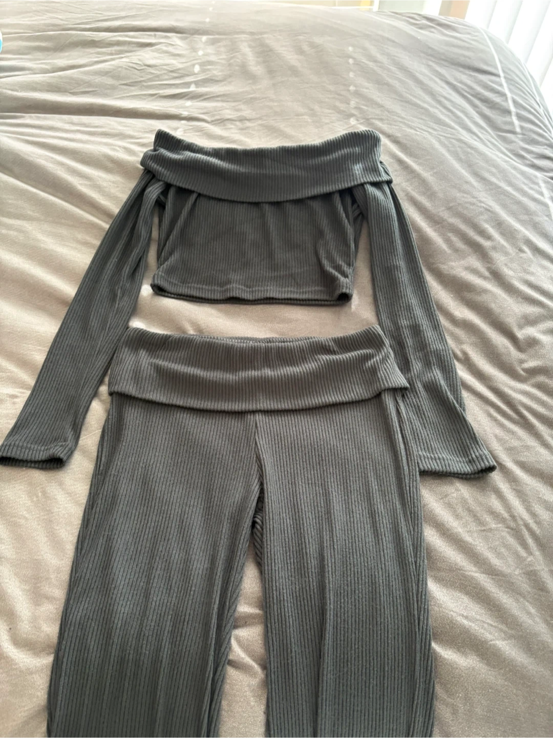 Ribbed knit set with an off-the-shoulder crop top and high-waisted flare pants. This outfit is a size small. It's made of a comfortable, stretchy material. Who would this be useful for? Someone looking for a stylish and casual matching set!