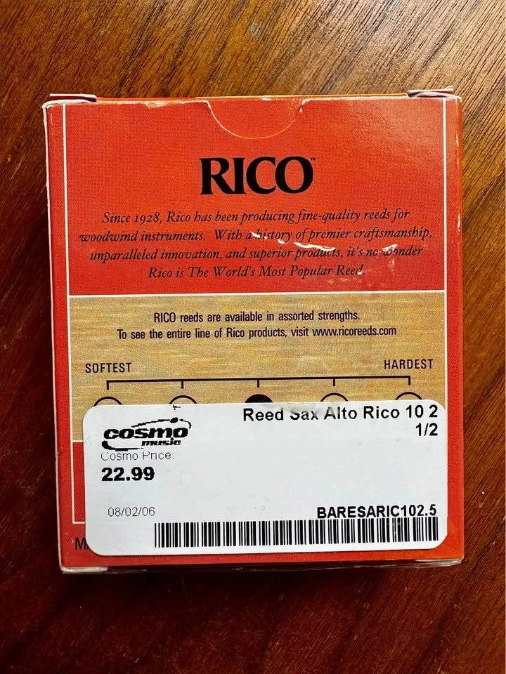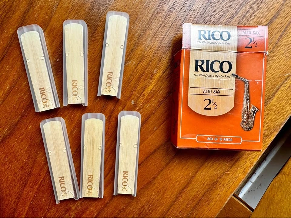 Box of 10 Alto Saxophone reeds. Size 2.5. 6 remaining unused and untouched brand new. See my other posts for other music accessories. Danforth & Coxwell.