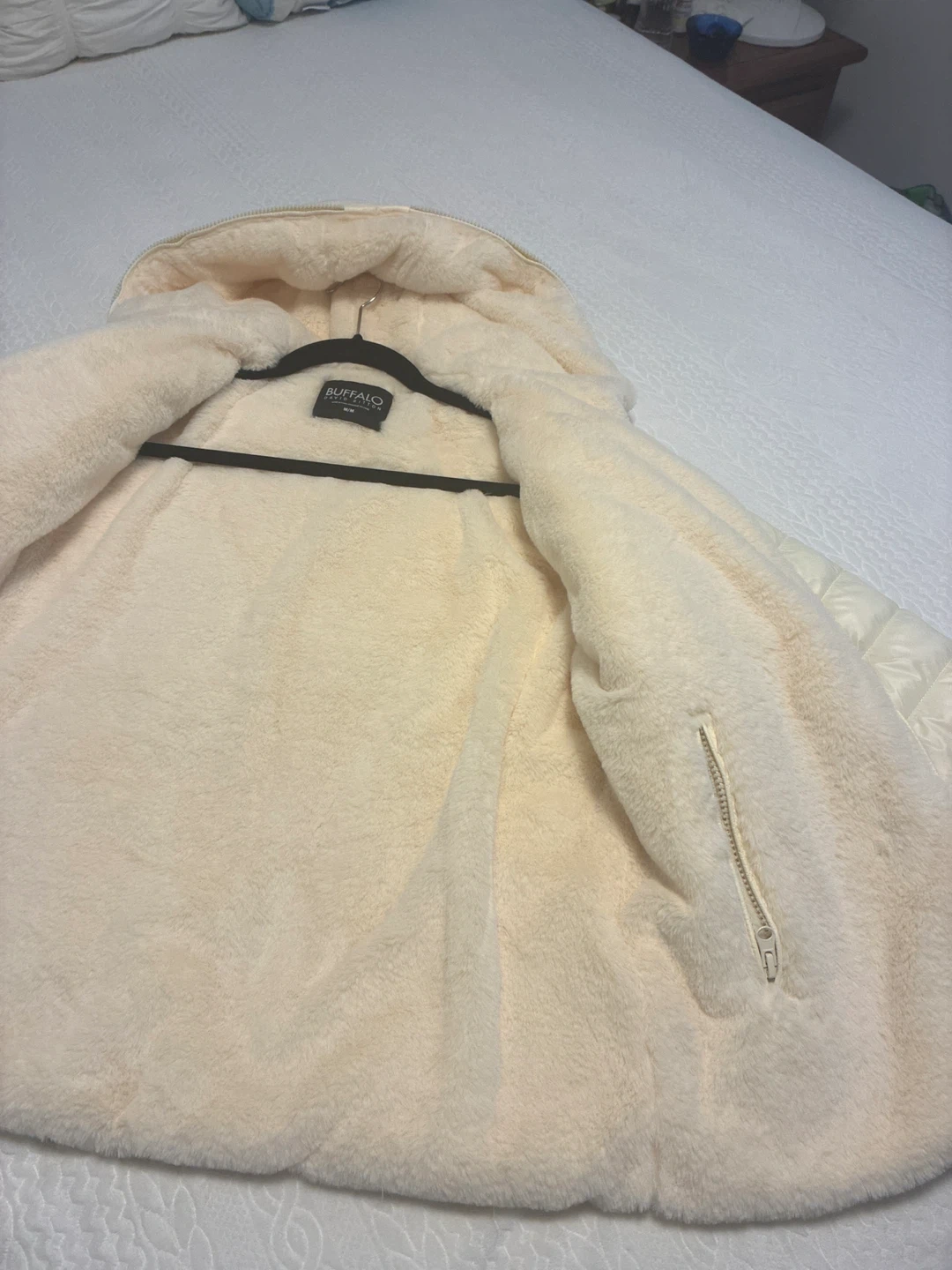 Cream coloured, hooded puffer jacket from Buffalo. It's lined with a soft, sherpa-style material and features a full zip closure. Side zip pockets are also included. This jacket is warm and stylish for cooler weather! Jacket is reversible.