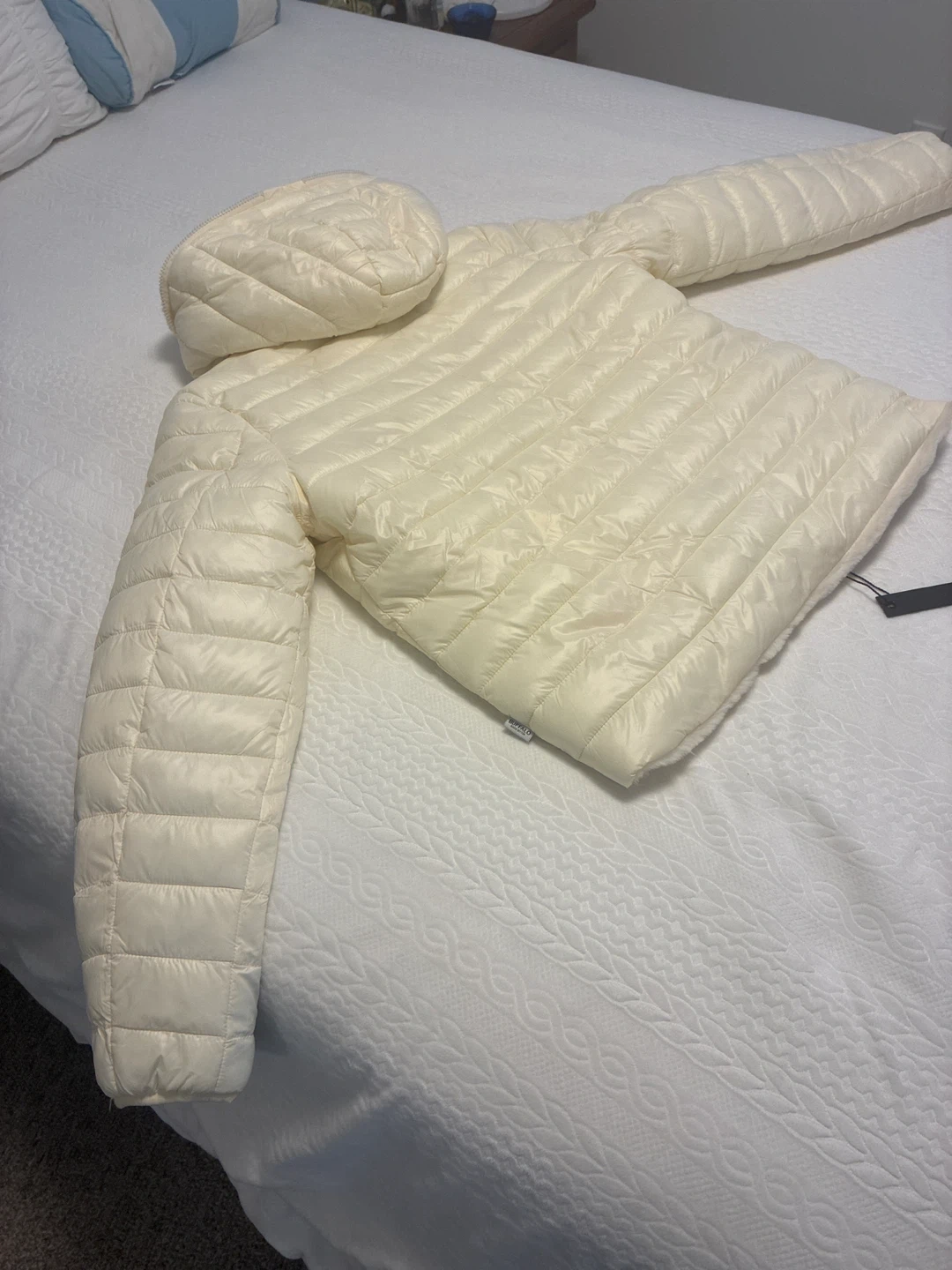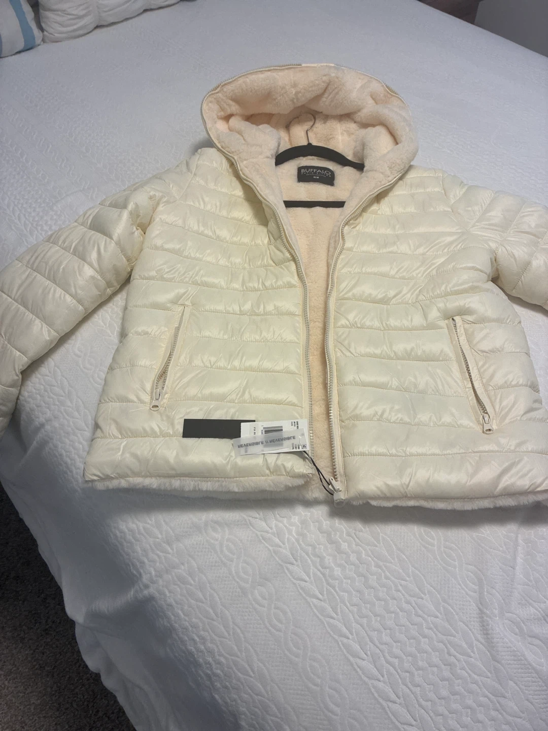 Cream coloured, hooded puffer jacket from Buffalo. It's lined with a soft, sherpa-style material and features a full zip closure. Side zip pockets are also included. This jacket is warm and stylish for cooler weather! Jacket is reversible.