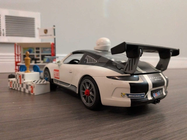Get ready to race with this used Playmobil Porsche 911 GT3 Cup set! This set includes the iconic Porsche 911 race car, two Playmobil figures, a pit stop station with tools, a winner's podium, and extra tires for quick changes. It's the perfect set for racers and car enthusiasts alike. It has been well loved and is in great shape. This toy set is sure to bring joy to any child or collector. Cash accepted.