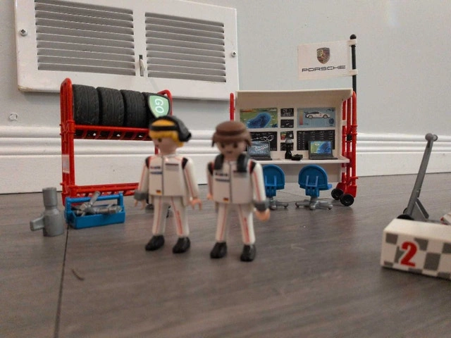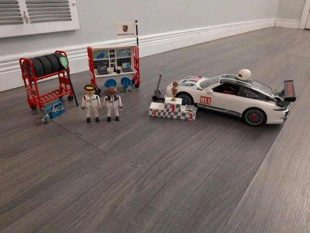 Get ready to race with this used Playmobil Porsche 911 GT3 Cup set! This set includes the iconic Porsche 911 race car, two Playmobil figures, a pit stop station with tools, a winner's podium, and extra tires for quick changes. It's the perfect set for racers and car enthusiasts alike. It has been well loved and is in great shape. This toy set is sure to bring joy to any child or collector. Cash accepted.