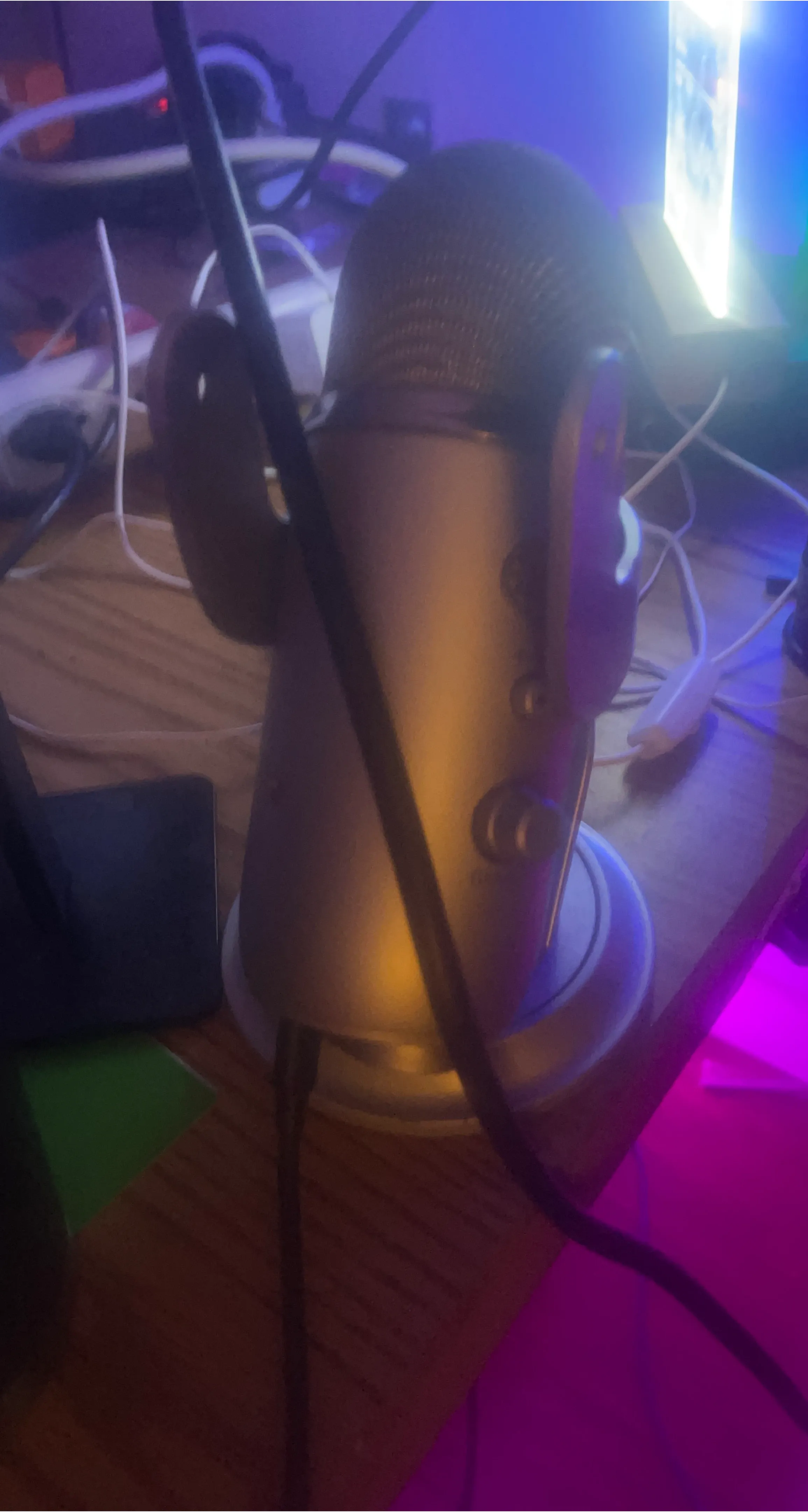 This is a Blue Yeti USB microphone in silver. It's a popular choice for streamers and podcasters. Great for recording voiceovers and music!
