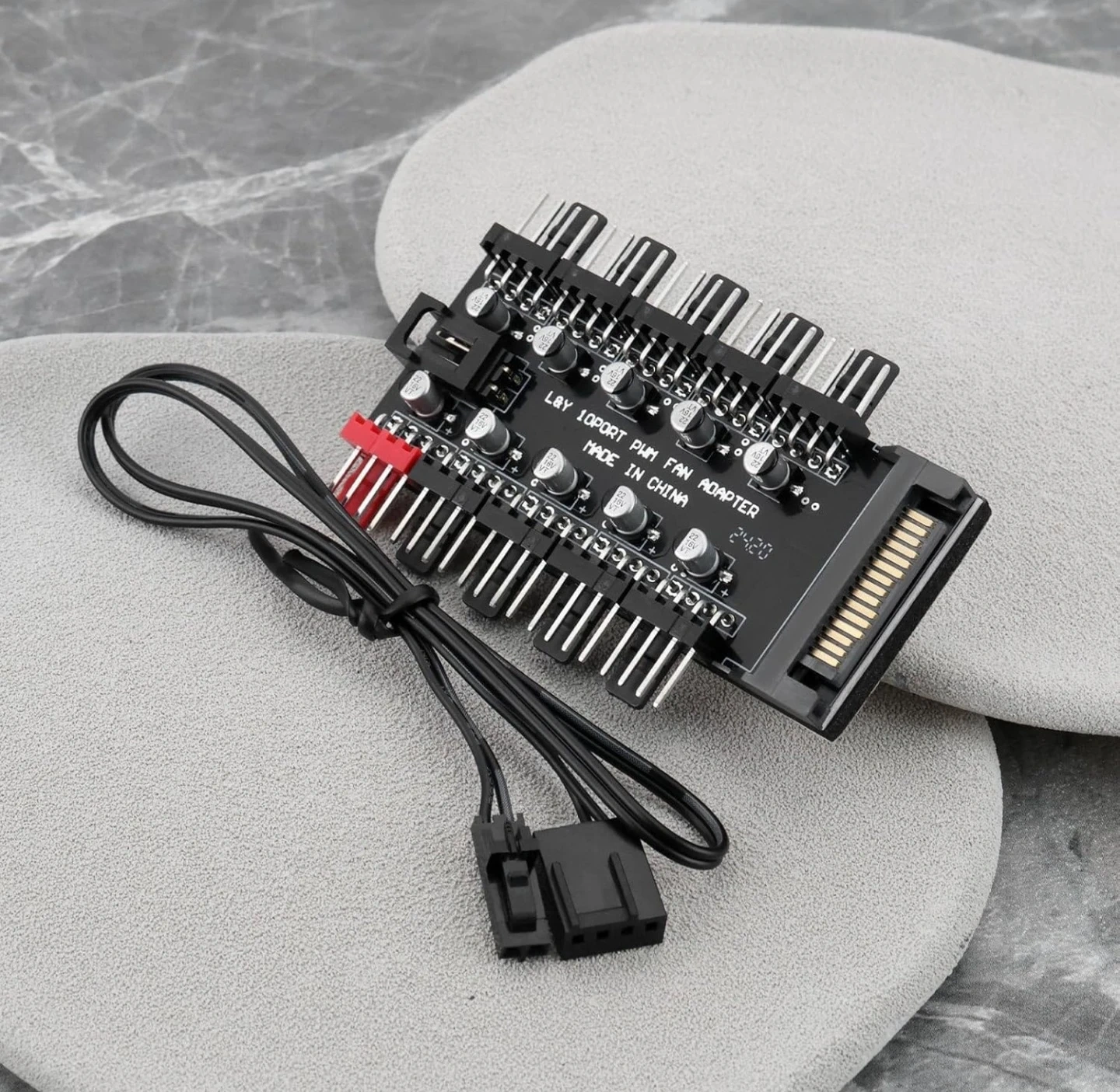 Connect up to 10 4-pins PWM fans to your computer with this hub. It's powered by a SATA connector and has a PWM signal input for speed control. Includes a cable for connection. Great for managing multiple case fans!