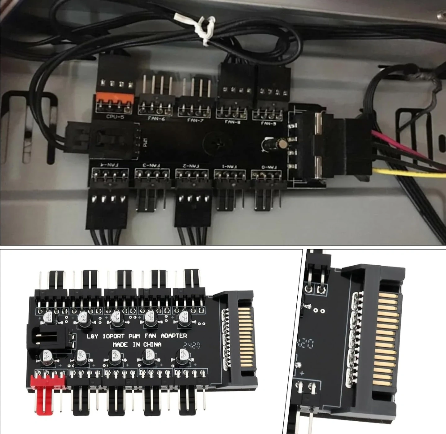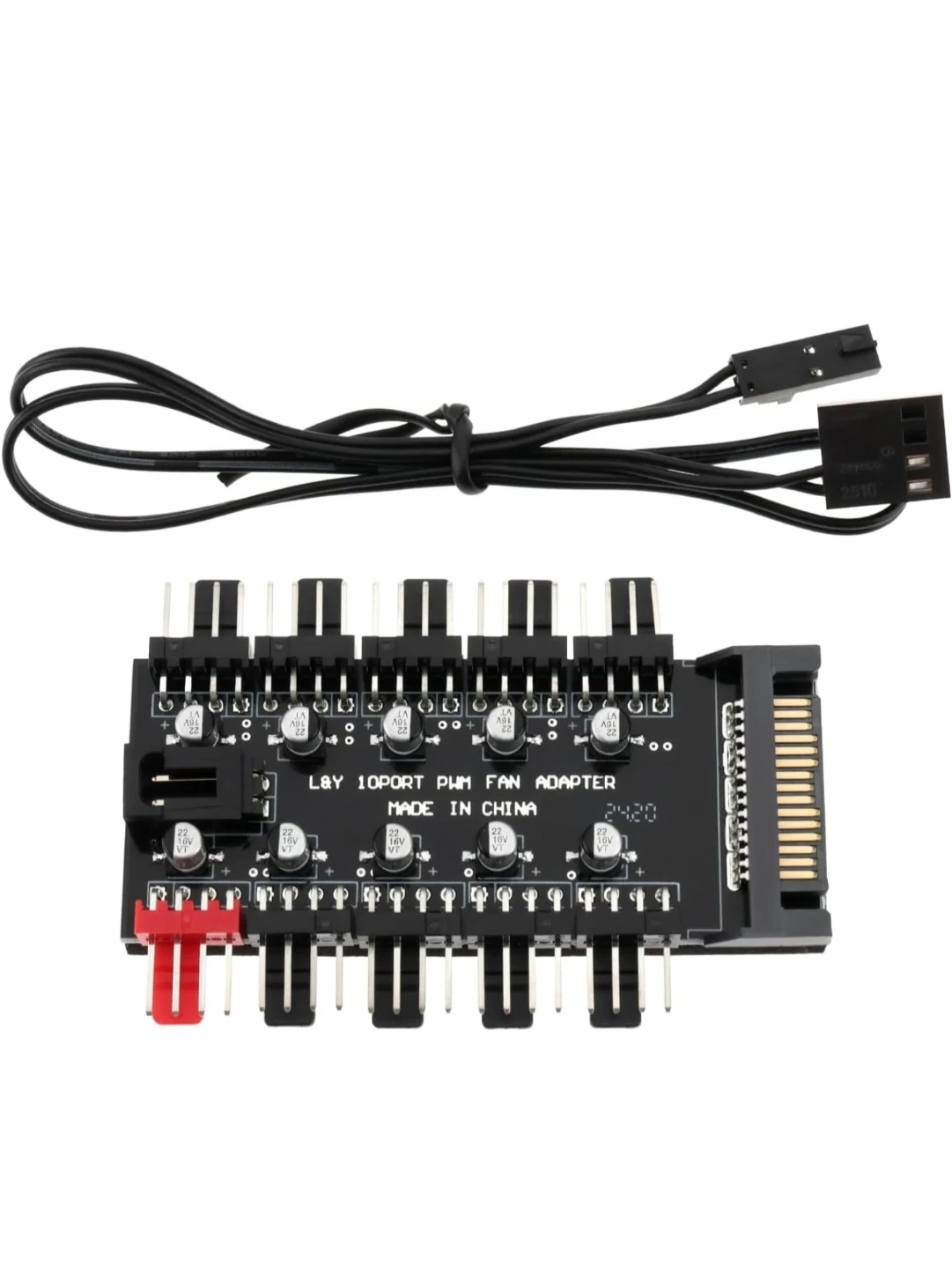 Connect up to 10 4-pins PWM fans to your computer with this hub. It's powered by a SATA connector and has a PWM signal input for speed control. Includes a cable for connection. Great for managing multiple case fans!