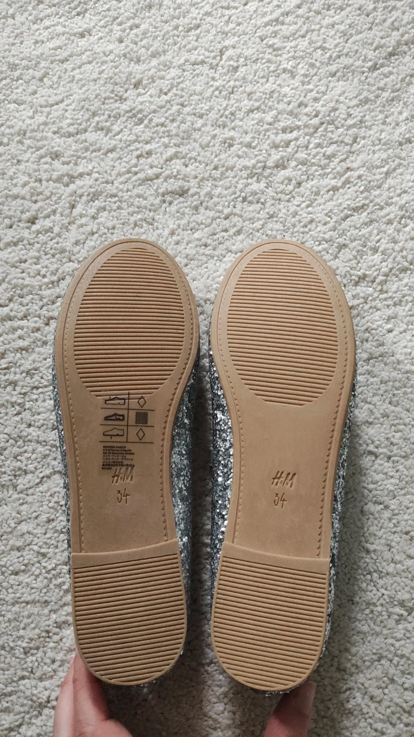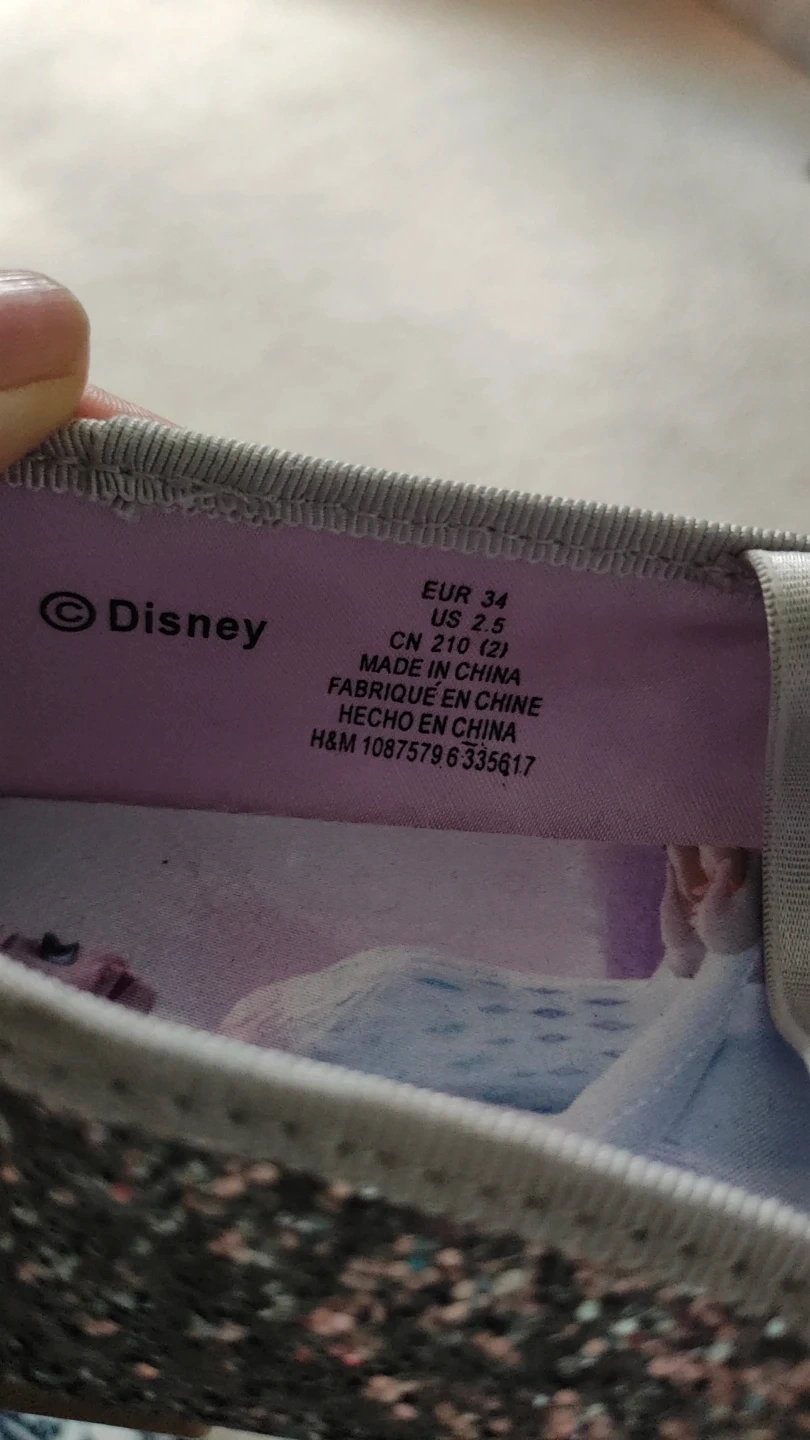 Sparkly silver glitter ballet flats featuring Disney's Elsa and Anna. These shoes are a EUR size 34, which is a US size 2.5. They're perfect for any little Frozen fan!