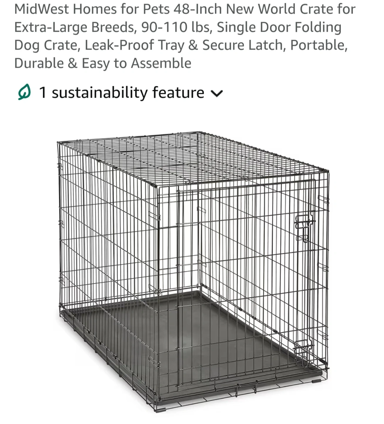This is a 48-inch folding dog crate from MidWest Homes for Pets. It's designed for extra-large breeds and features a single door with a secure latch. It's portable and easy to assemble.