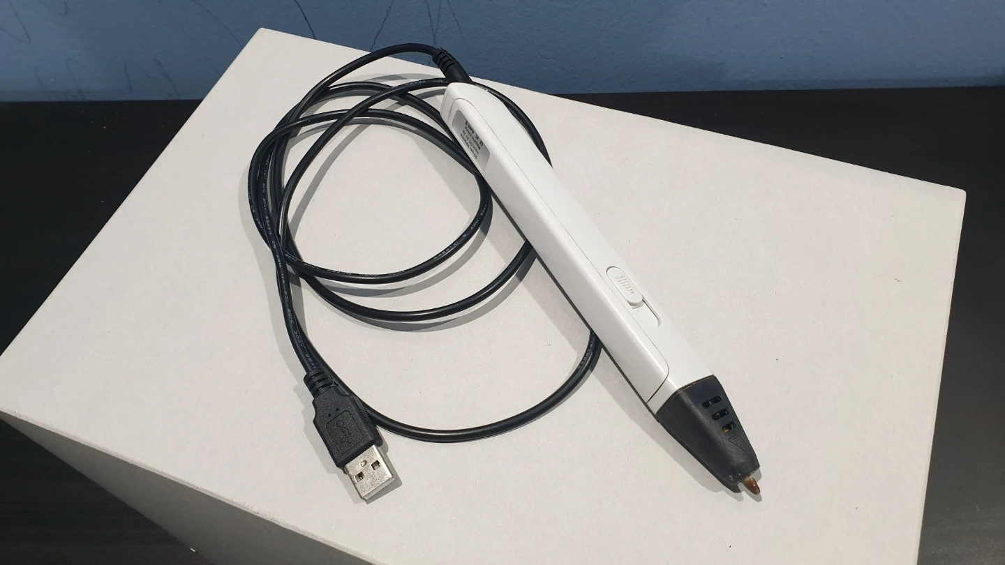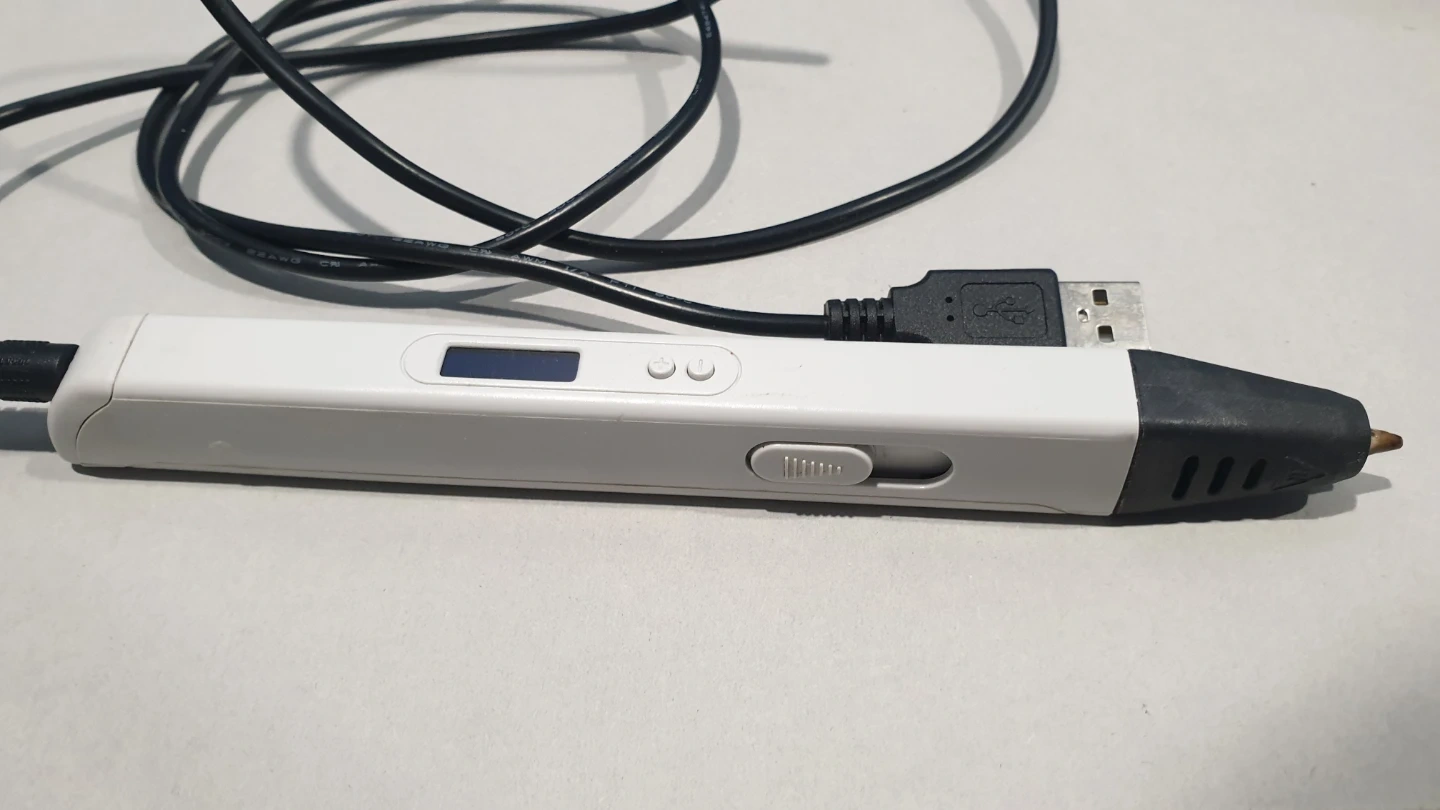 This 3D printing pen, model RP800A, comes with a user manual and PLA filaments in various colours. It's powered by USB and features an LED display for temperature settings. The bundle includes the pen, a USB cable, and new and used PLA filament. Good for education and hobby