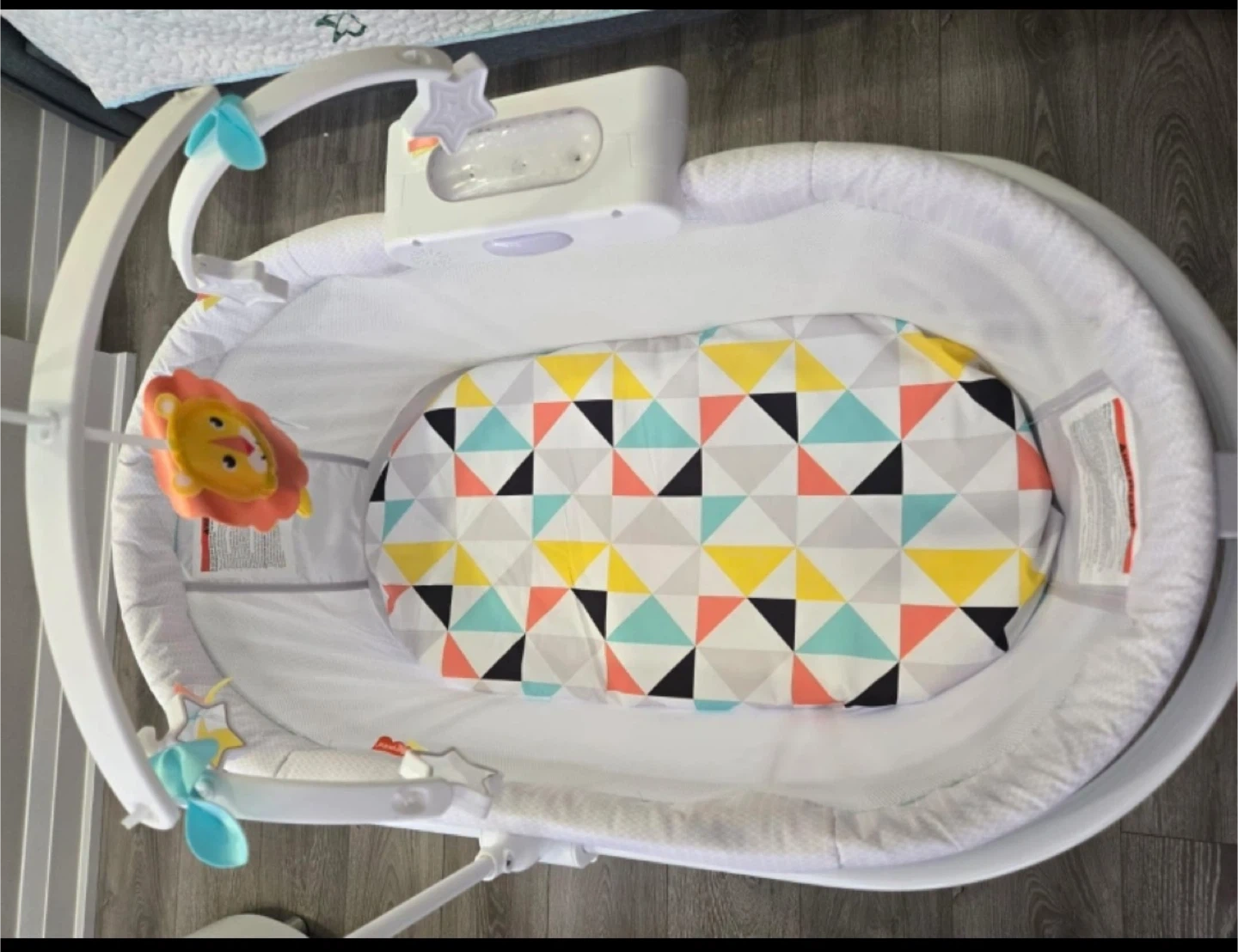 Selling a Fisher-Price Soothing Motions Bassinet. It's in great condition and ready for a new little one! This bassinet features gentle swaying motions, calming vibrations, and soothing music to help your baby drift off to sleep. The overhead mobile with toys is sure to entertain!