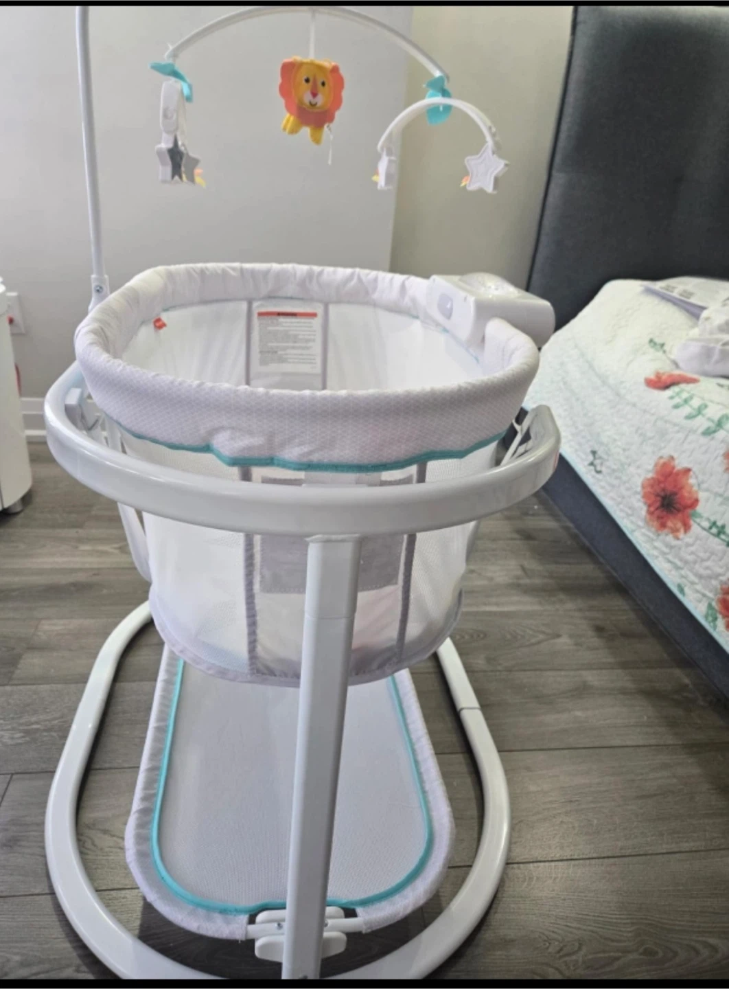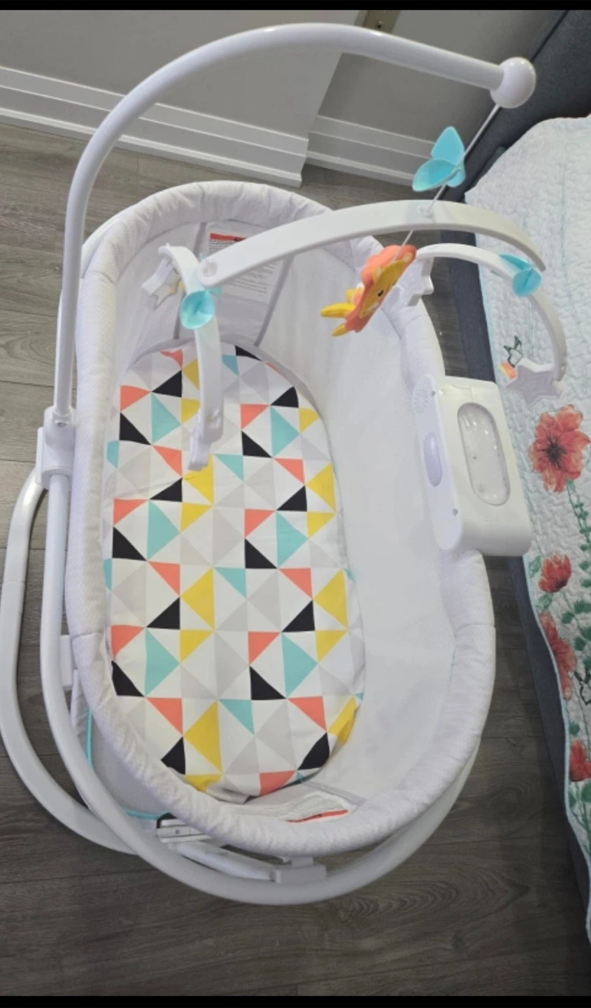 Selling a Fisher-Price Soothing Motions Bassinet. It's in great condition and ready for a new little one! This bassinet features gentle swaying motions, calming vibrations, and soothing music to help your baby drift off to sleep. The overhead mobile with toys is sure to entertain!