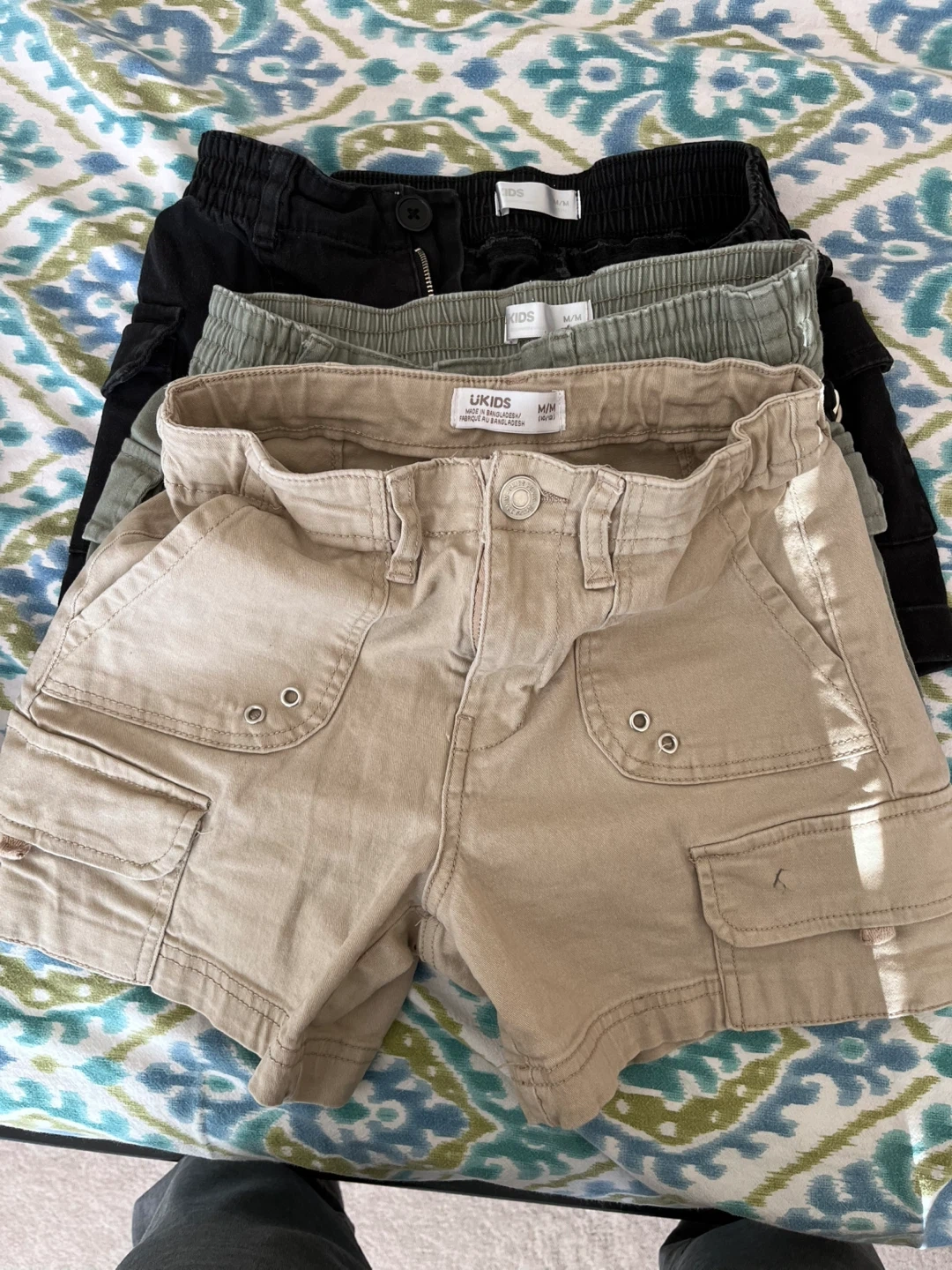 Selling a set of 3 kids shorts from UKIDS! The shorts are size M/M 10-12 and come in three different colours: black, green and beige.