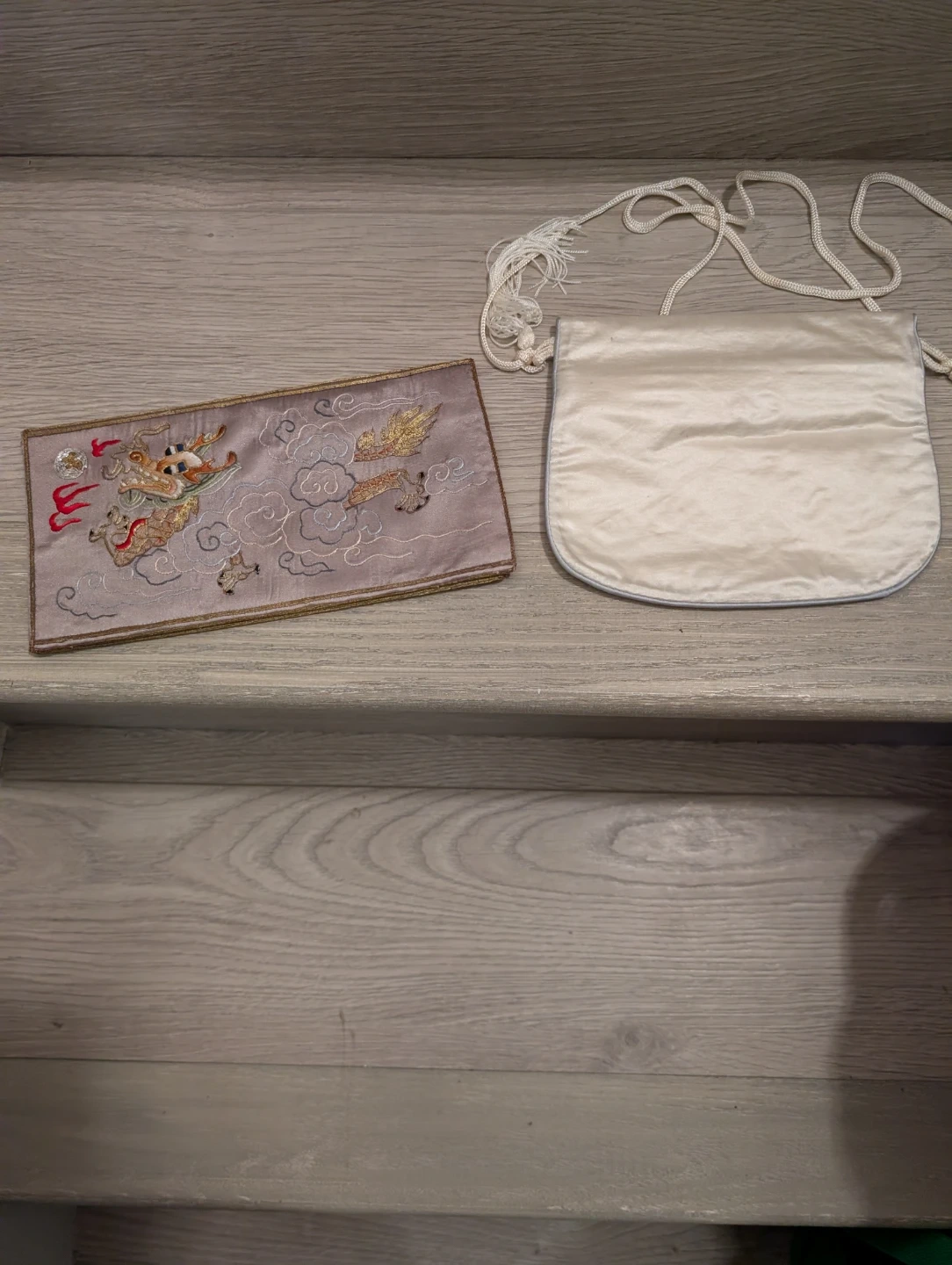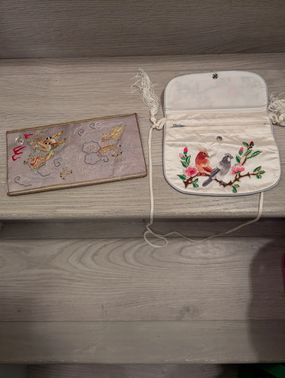 This set includes an embroidered clutch with a bird and floral design, and a matching coin purse featuring a dragon motif. Both are made of silk-like material with decorative tassels and embroidery. It's perfect for holding small essentials like coins, cards, or makeup.