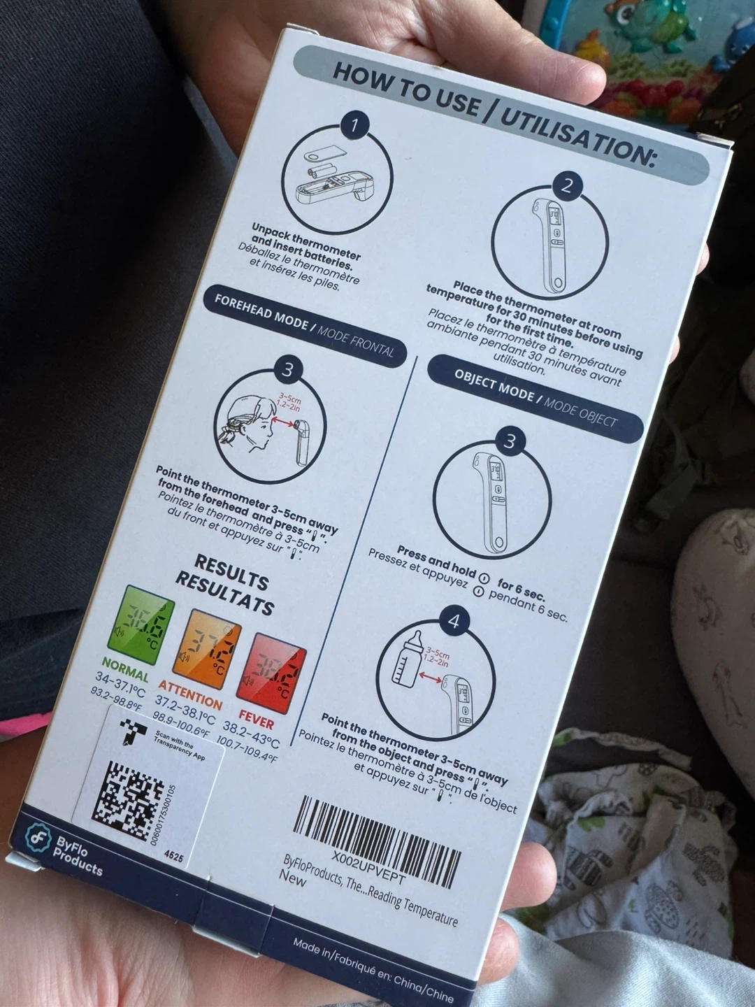 ByFlo Products infrared forehead thermometer. Contactless readings in 1 second. Results in Celsius or Fahrenheit. Memory function stores 9 results.